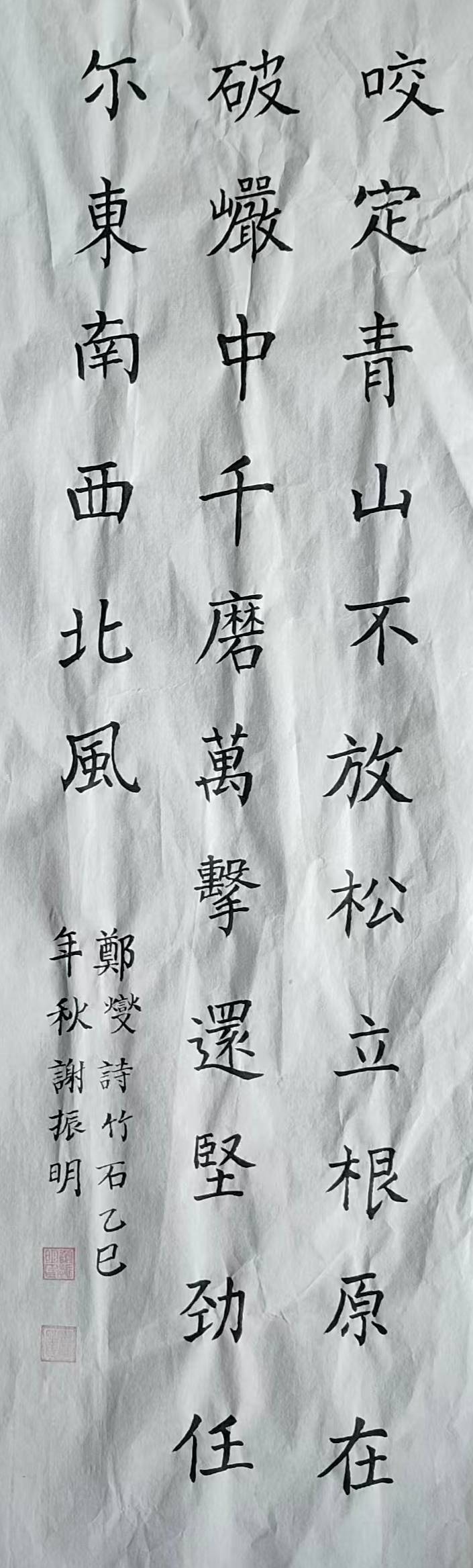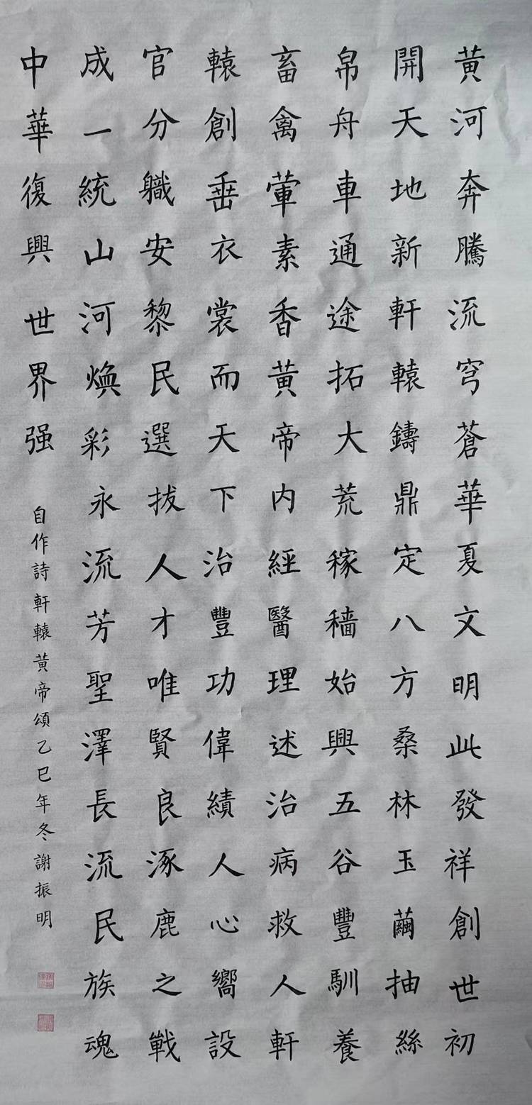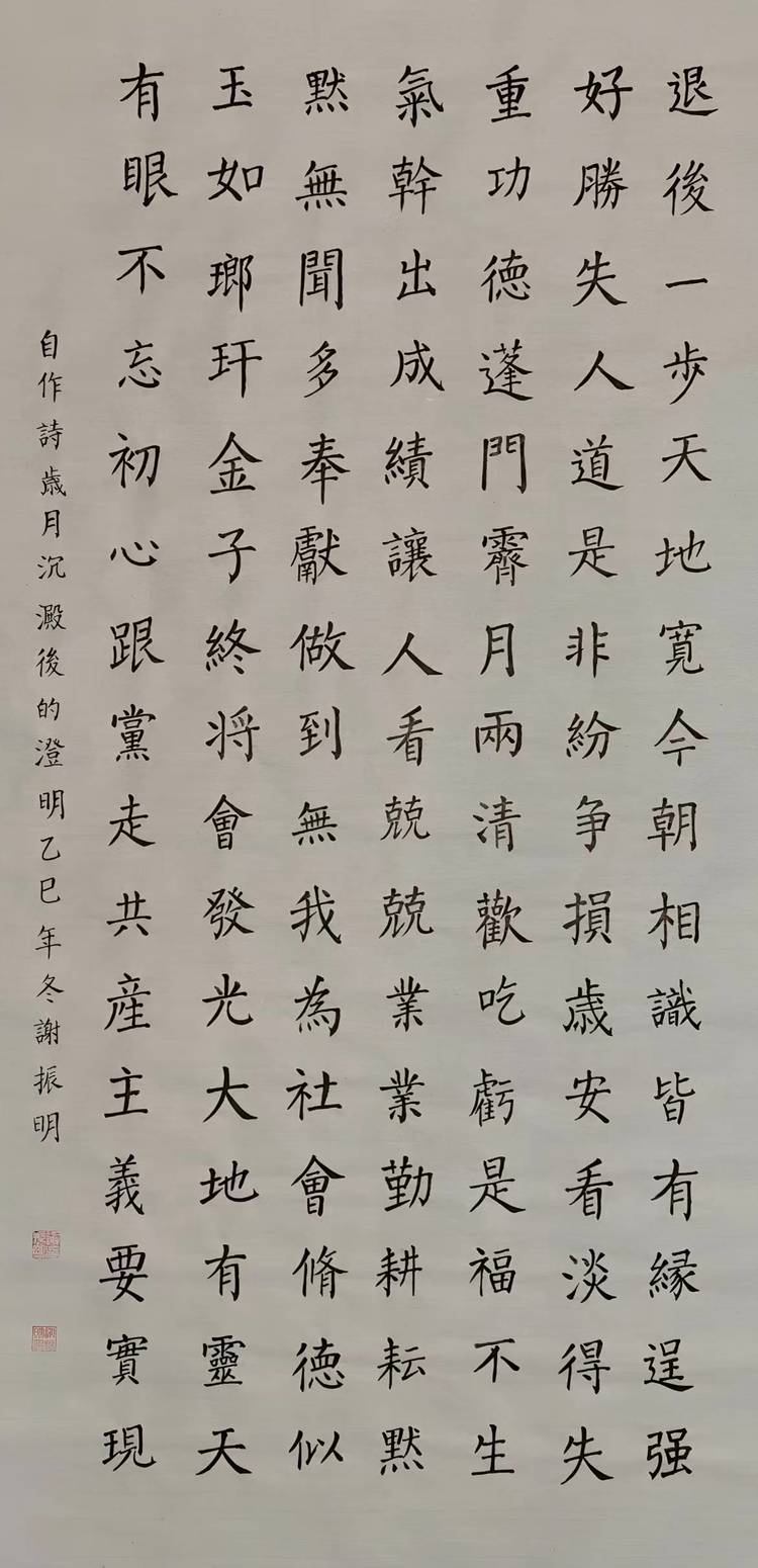 谢振明,四川南江人,自幼文墨兼修,笔墨耕耘数十载。现为一级书法师,中国诗书画印研究院院士,中国民间书画研究会理事,河南省韵墨书画院副院长,中华诗词学会会员。作品多次入选全国书法大赛并获奖;数十幅佳作入编相关书籍和《中华艺术史》《中国名家书画作品集萃》《国脉传承艺术名家》《中国书画家大辞典》等艺术典籍,九幅作品被专业机构永久收藏。去年二十余幅作品入选“文化强国·国家名片”主题邮票珍藏册,获评中国文化典范人物,国宝级艺术大师等多个荣誉称号。 谢振明秉持“功夫在字外”的创作理念,以德润艺、自省自励。自创九百多字的现代诗《我爱美丽的攀枝花市》、二百多字的七字诗《感恩领袖邓小平》收录于《书香雅颂·获奖诗歌选集》;一千三百多字的七字诗《邓小平理论永放光芒》以文载道、以书传情,既是文学作品,又是书法艺术作品,入编多部典籍。同时也被《亚太作家文化作品交流集》入编。艺术成就获今日头条、百度等主流媒体多次专题报道。