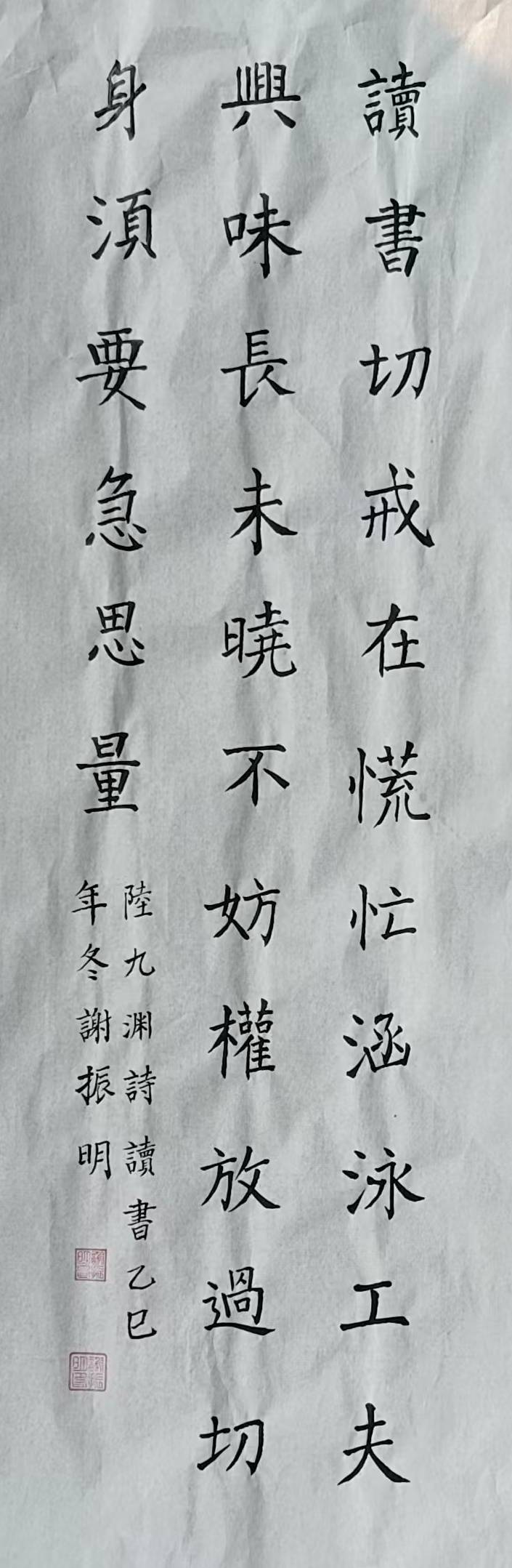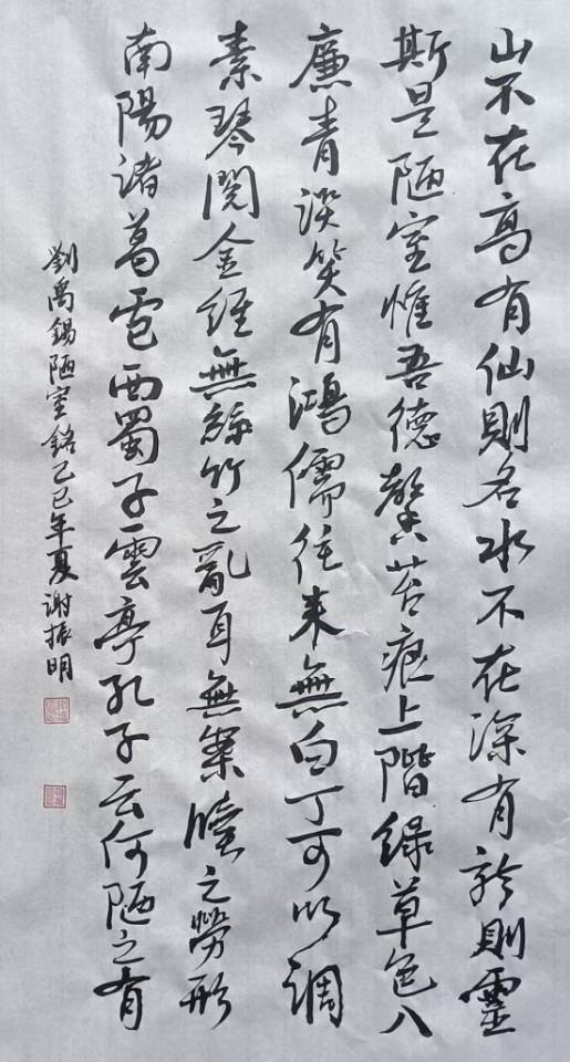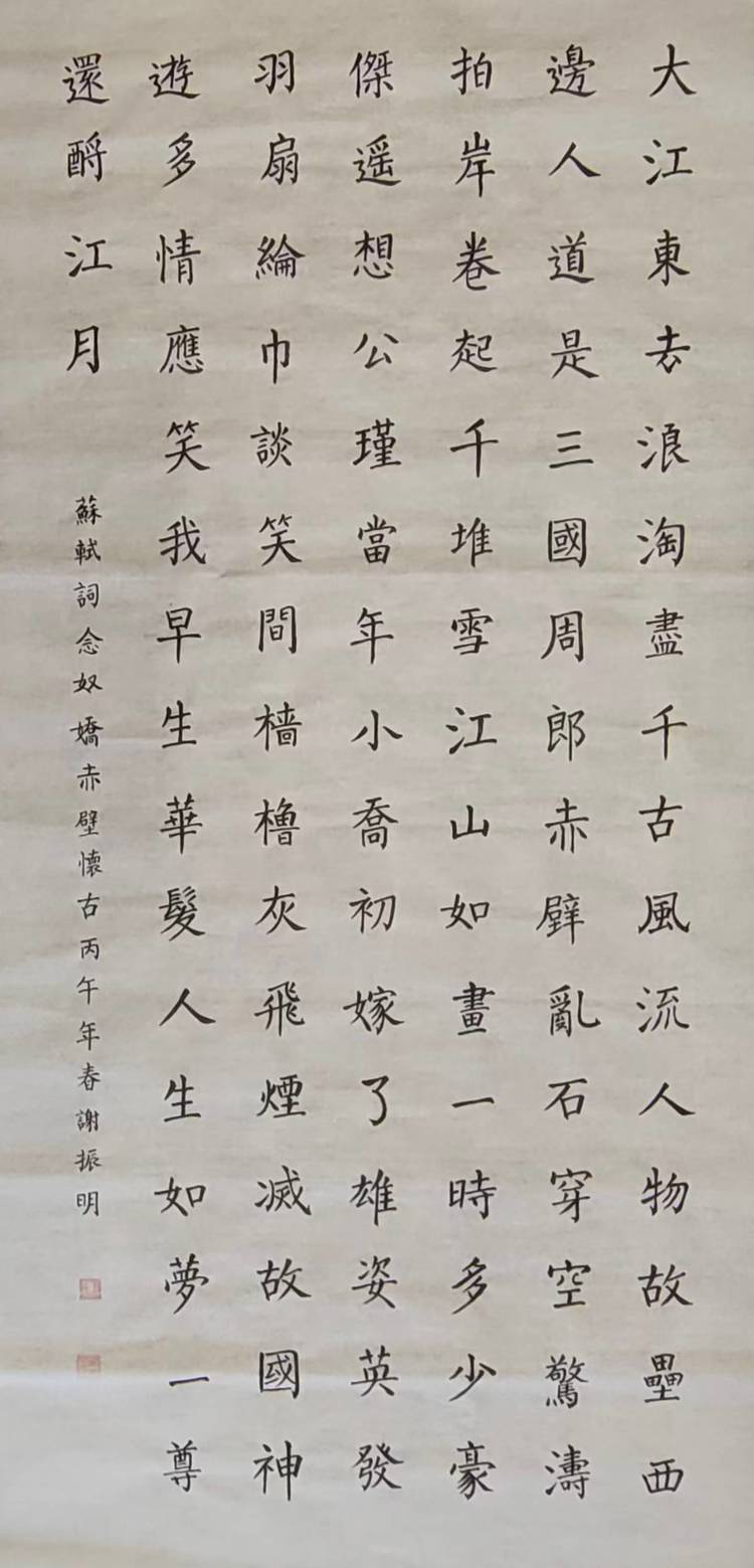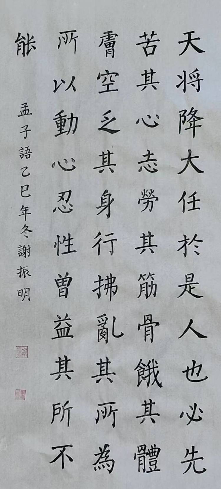 谢振明,四川南江人,自幼文墨兼修,笔墨耕耘数十载。现为一级书法师,中国诗书画印研究院院士,中国民间书画研究会理事,河南省韵墨书画院副院长,中华诗词学会会员。作品多次入选全国书法大赛并获奖;数十幅佳作入编相关书籍和《中华艺术史》《中国名家书画作品集萃》《国脉传承艺术名家》《中国书画家大辞典》等艺术典籍,九幅作品被专业机构永久收藏。去年二十余幅作品入选“文化强国·国家名片”主题邮票珍藏册,获评中国文化典范人物,国宝级艺术大师等多个荣誉称号。 谢振明秉持“功夫在字外”的创作理念,以德润艺、自省自励。自创九百多字的现代诗《我爱美丽的攀枝花市》、二百多字的七字诗《感恩领袖邓小平》收录于《书香雅颂·获奖诗歌选集》;一千三百多字的七字诗《邓小平理论永放光芒》以文载道、以书传情,既是文学作品,又是书法艺术作品,入编多部典籍。同时也被《亚太作家文化作品交流集》入编。艺术成就获今日头条、百度等主流媒体多次专题报道。