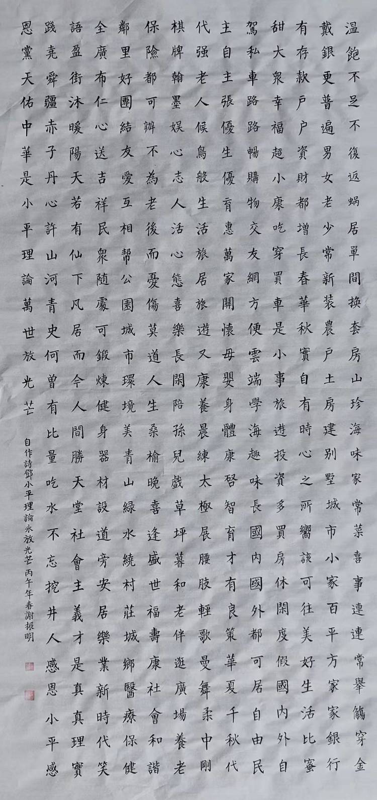 邓小平理论永放光芒谢振明偉大小平民心嚮改革開放譜新章歷史轉折開盛世太平萬年史首創(1)萬卷藍圖揮妙筆龍騰虎躍中華疆玉宇澄澈瘴霧散華夏騰飛要遠航中國速度驚世界世界中國是榜樣三起三落銘國史世界歷史都增光前無古人眾者來(2)引領大旗世界揚創新馬列毛理論人類發展新希望馬恩列毛很欣慰活在心中我念想共產主義要實現歷史潮流不可擋扭轉危局華夏安砸碎枷鎖破條框扶固大廈之將傾撥亂反正正氣揚力挽狂瀾於既倒終结文革是滄桑平反冤案昭日月社會正義大伸張真理實踐大討論不迷信解放思想發展才是硬道理擲地有聲語鏗鏘實業强國是基礎百廢待興廣招商對內對外要搞活融入國際大市場人才各國都互動充分發揮人特長中外合資企業興新增億萬工作崗職業招聘信息多城鄉大眾擇業廣鋤落三春賦稅止(3)史頁張張銘惠嚮東南西北任君行如鳥藍天在飛翔風雲入世十多年(4)華夏商譽美四方各國政策都銜接各美其美美共享世界資源為我用(5)恢復高考育棟梁德治天下民心聚科教興国戰略强两个文明齊發展眾志成城創輝煌土地承包農家樂荒山巨變米糧倉企業改製增活力科技经濟世界强