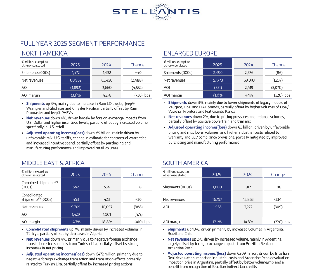 财报显示,2025年Stellantis新车出货量共计为548万辆,其中北美市场出货量147万辆,南美市场出货量100万辆,欧洲市场出货量249万辆。