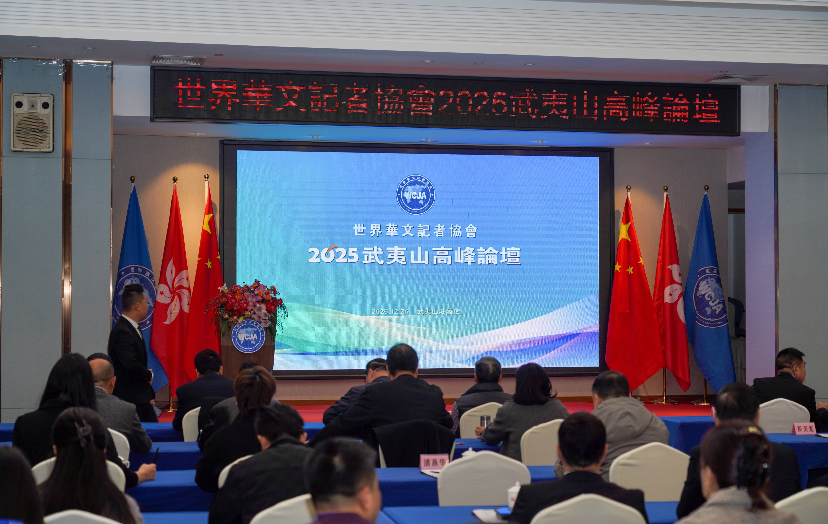 12月26日,武夷山庄酒店“大王阁”国际会议厅内高朋满座、思想激荡,世界华文记者协会2025武夷山高峰论坛正式拉开帷幕。来自全球各地的华文媒体精英、举办地有关部门领导、文化学者八十余人齐聚这座“双世遗”胜地,以“焕发华媒活力 讲好中国故事”为主题,共商华文媒体发展大计,共探中华文化国际传播新路径。