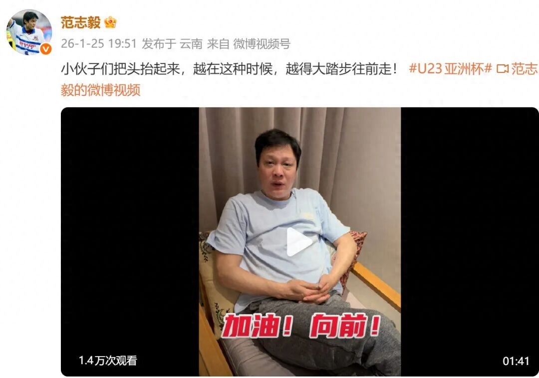 北京时间1月25日凌晨,中国U23男足0比4不敌日本,获得2026年U23亚洲杯亚军。足球运动员范志毅发视频鼓励U23男足:“小伙子们把头抬起来,越在这种时候,越得大踏步往前走!接受这个事实,但是你得咬着咬挺过这一关,加油!”