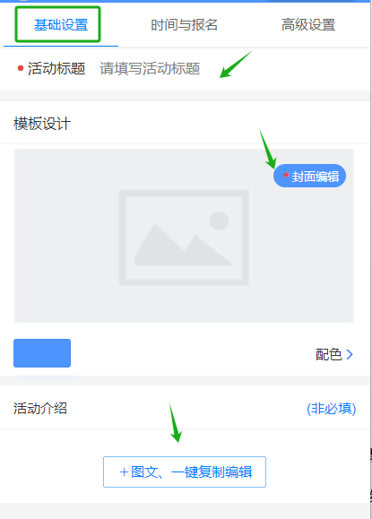 基础信息设置:填入活动标题,上传一个精美的封面图,外加一段活动介绍详情。