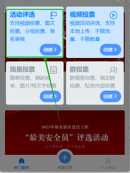 进入小程序首页后,直接拉到最下方的 “创建投票” 按钮,点一下就能开始创建投票。系统会跳出好几种投票模板,能适配不同的场景:最常用的就是 “活动评选” 模板,排版好看还能放图片和视频;直接套用准没错。