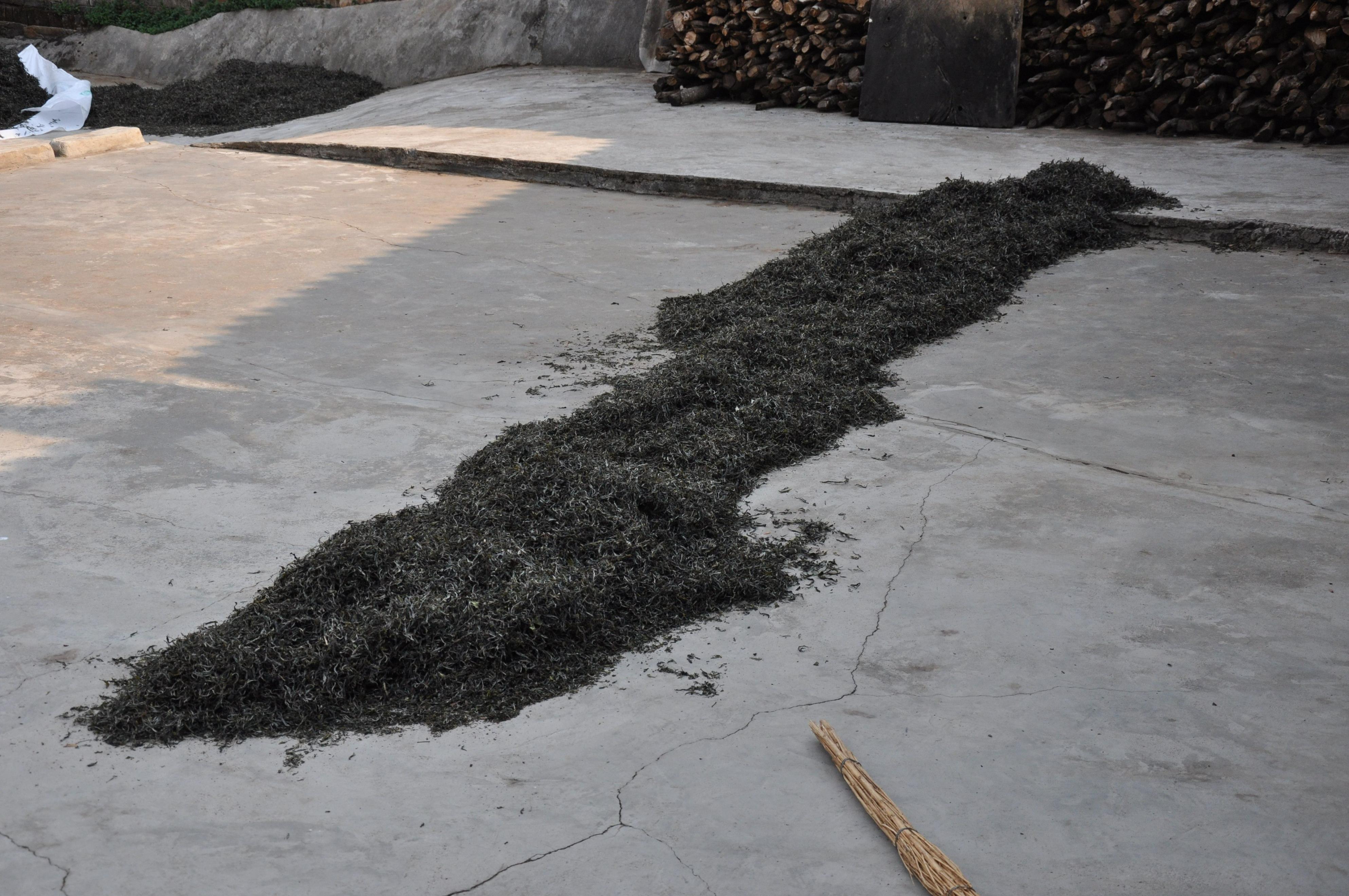 2010年,茶山基础设施不好,晒茶,哪像现在一样有晒场,茶农家门前的水泥地板,几桶水一冲,地板干了,直接地板上晒。茶农家刚会打酱油的儿子,提根棍子看着,怕鸡上去跑。