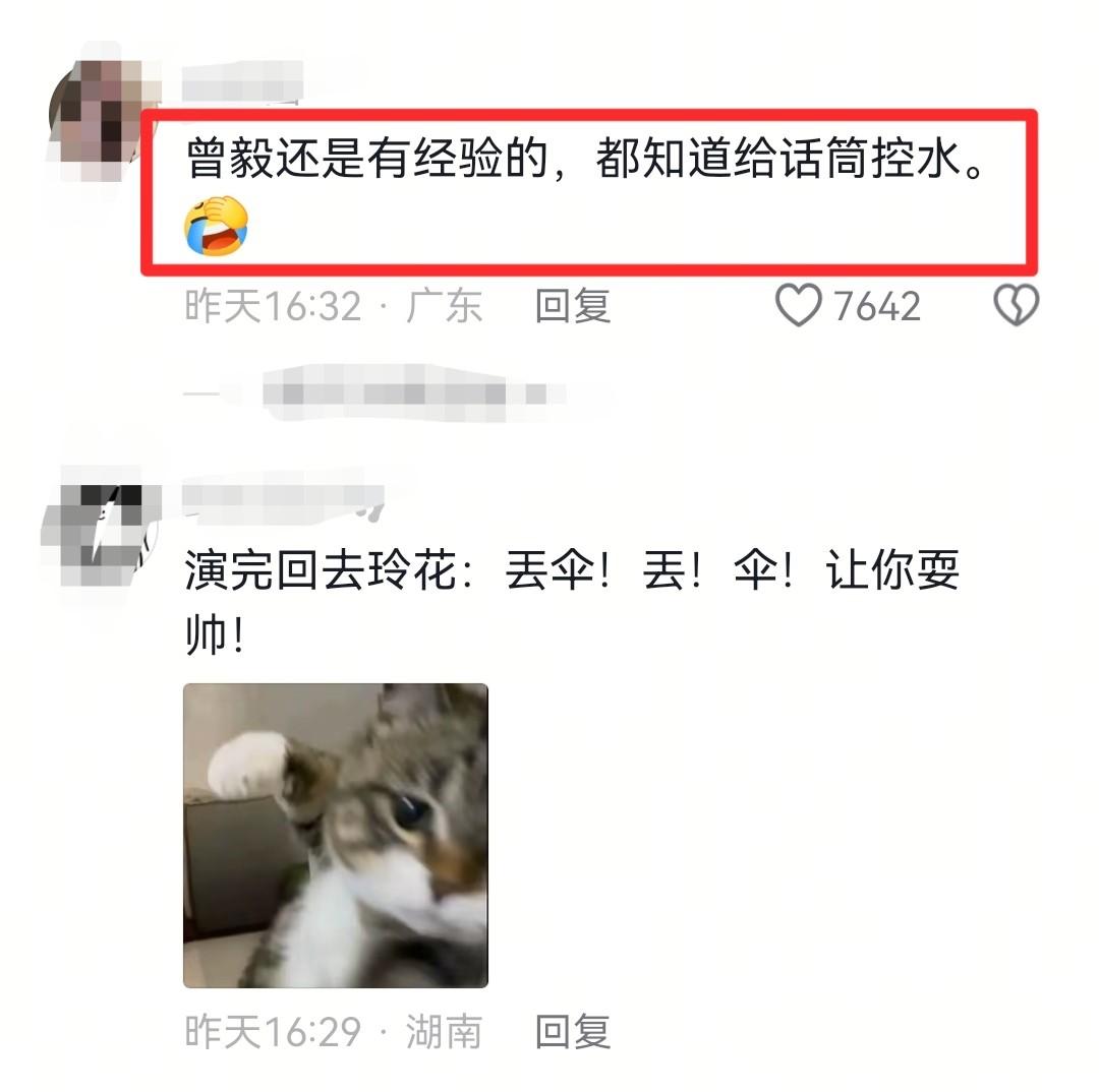 反观曾毅那边,好像是早有准备一样,给自己搞了一个门帘发型,正好可以挡雨,话筒也是向下拿着,可以控水,一点也不影响唱歌