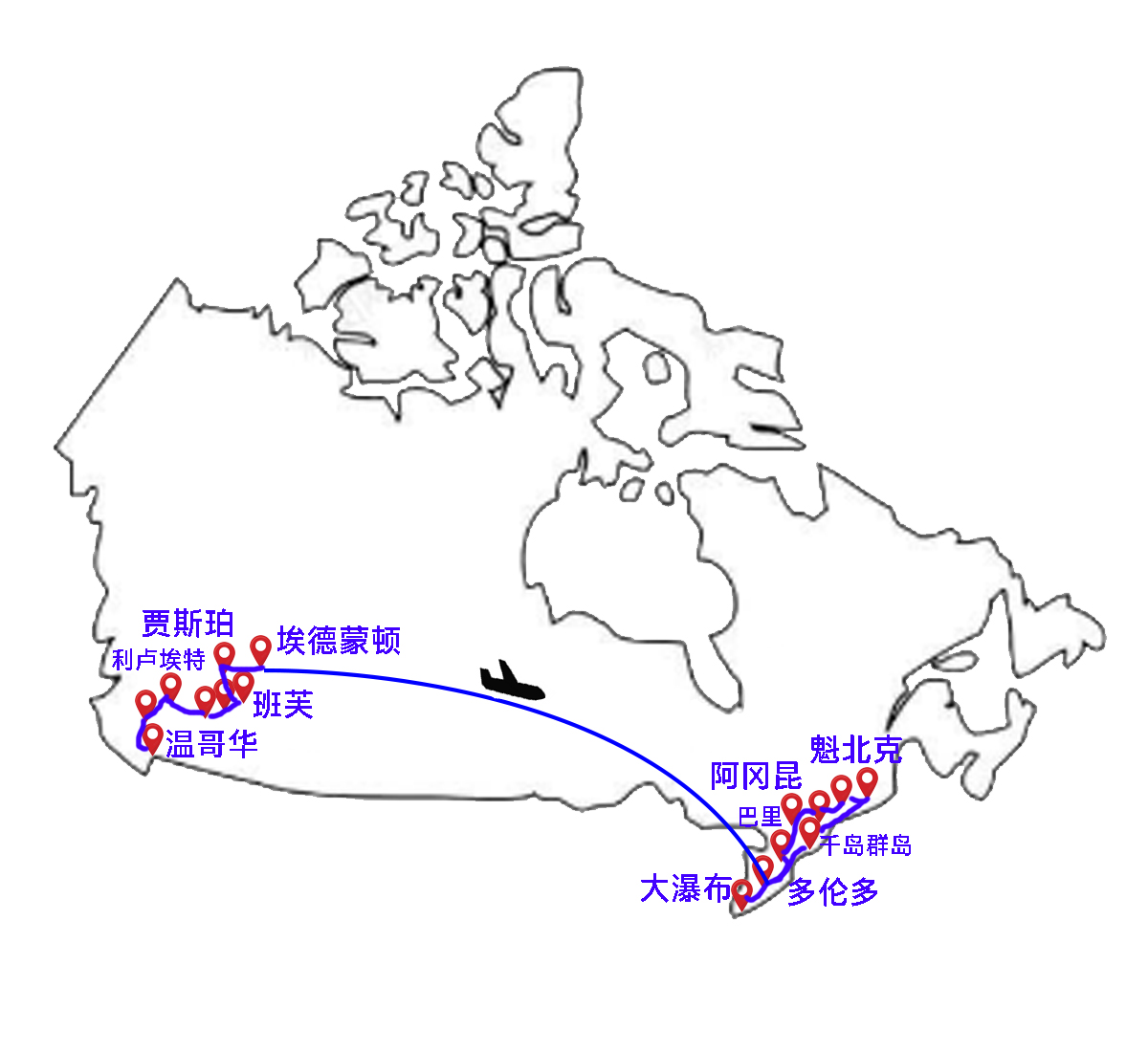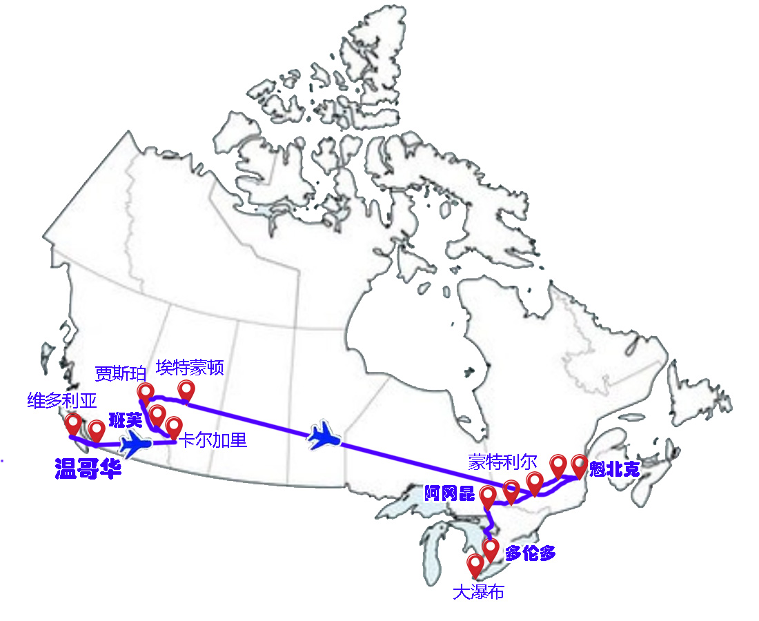 D1:国内(北京/其他城市) ✈ 温哥华D2:温哥华D3:温哥华海天之路加里波第省立公园利卢埃特D4:利卢埃特1号公路起始河谷段勒维斯托克山国家公园雷夫尔斯托克D5:雷夫尔斯托克冰川国家公园幽鹤国家公园班夫D6:班夫国家公园D7:班夫国家公园冰原大道 贾斯珀国家公园D8:贾斯珀(玛琳湖、精灵岛)埃德蒙顿D9:埃德蒙顿 ✈ 多伦多巴里D10:巴里享茨维尔(枫叶大道)阿冈昆省立公园D11:阿冈昆(枫叶大道)渥太华D12:渥太华(枫叶大道)蒙特利尔D13:蒙特利尔(枫叶大道)魁北克D14:魁北克D15: 魁北克(枫叶大道)莫里斯国家公园圣伊亚辛特D16:圣伊亚辛特千岛群岛国家公园加纳诺克D17:加纳诺克京斯顿多伦多D18:多伦多尼亚加拉大瀑布多伦多D19:多伦多 ✈国内(北京或其他城市)D20:抵达国内(北京或其他城区)