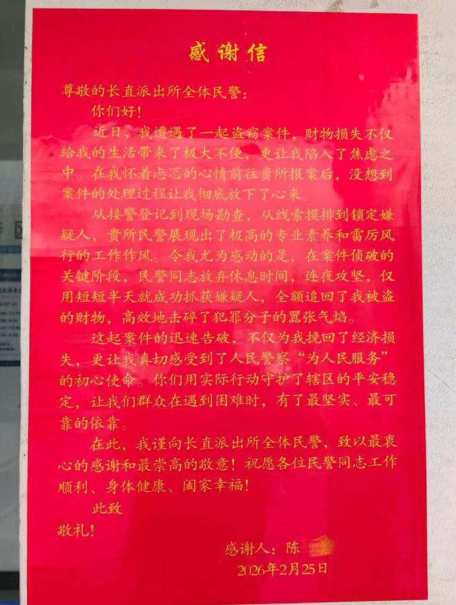 2月25日,陈先生专程来到长直派出所,将锦旗和感谢信交到民警手中。他激动地表示,没想到春节期间警察办案如此迅速高效,不仅帮自己挽回了损失,更让他感受到了公安机关守护平安的坚定决心。