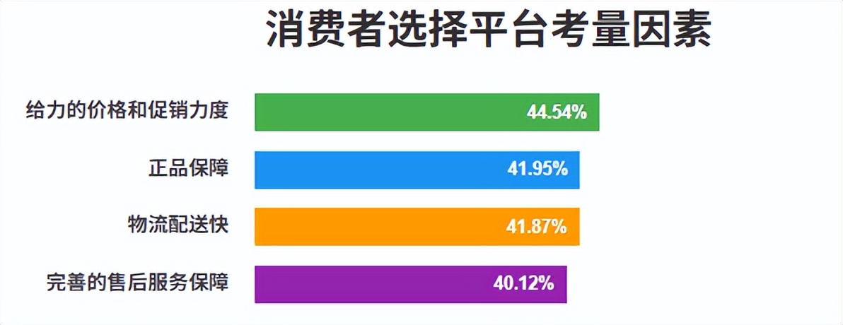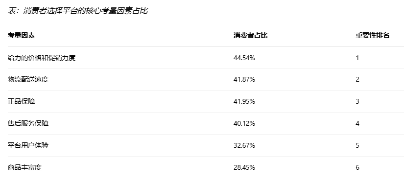 消费者选择平台时,正品保障(41.95%)、给力的价格和促销力度(44.54%)、物流配送快(41.87%)和完善的售后服务保障(40.12%)成为用户最重要的四大考量因素。这些因素共同构成了消费者心中“靠谱平台”的标准,表明消费者在追求低价的同时,更加注重购物全链路的可靠性和安全性。