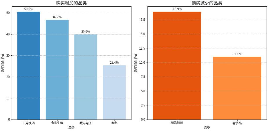从实际销售数据看,满足生活需求的日用快消(50.5%) 与 食品生鲜(46.7%) 稳居前列,数码电子(39.9%)与家电(25.4%)等高价品类仍保持稳定;而在购买减少的品类中,奢侈品(11.0%)与服饰鞋帽(18.9%)等非刚需品类则出现降温。这种品类偏好分化反映出消费者在保障日常生活需求的同时,也愿意在特定领域进行消费升级,呈现出“按需分级”的理性特征。