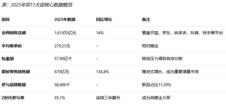 2025年双11以全网销售额1.619万亿元(同比增长14%)收官,在宏观环境与消费理念变革下,理性消费成为核心特征。消费者的行为模式呈现出从“冲动囤货”到 “按需分级” 的显著转变。