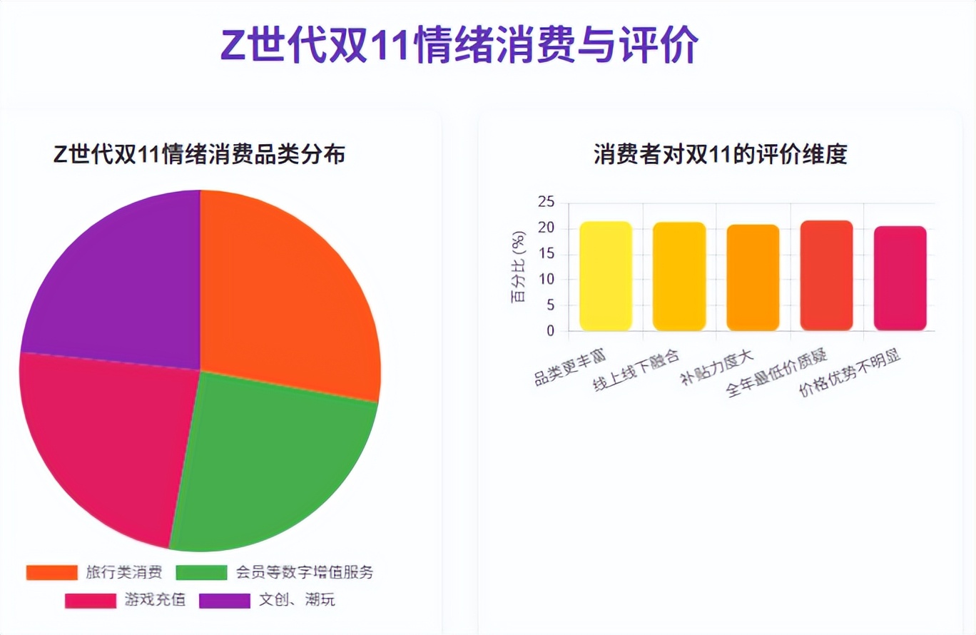 这种“为快乐买单”的心态反映了Z世代将消费视为情感表达和自我实现的重要方式。他们对双11的评价维度不仅限于价格和实用价值,更关注消费带来的情感满足和社交认同。众多受访者对今年的双11给予了积极评价,认为品类更丰富(21.4%),线上线下融合更明显(21.3%),补贴力度更大、更划算(20.8%)等。也有受访者表达了消极看法,主要集中在对“全年最低价”等宣传承诺的质疑(21.6%)以及价格优势不明显(20.5%)上。