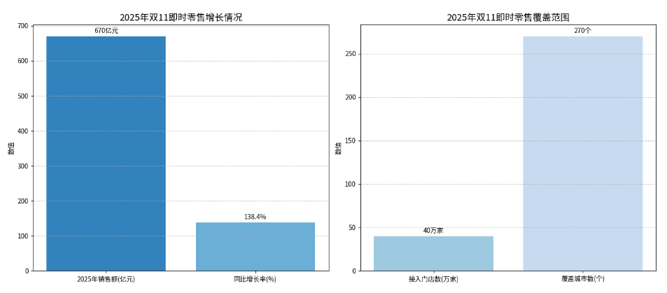 即时零售的爆发式增长是2025年双11的突出亮点,它重构了消费者对购物时效的期望,催生了“即想即得”的消费行为。数据显示,全渠道即时零售销售额达670亿元,同比激增138.4%,全国有40万家门店接入闪购服务,覆盖270个城市。这种“线上下单、小时达”的服务模式已成为消费者,特别是95后、00后的标准预期,满足了他们对时效的极致追求。