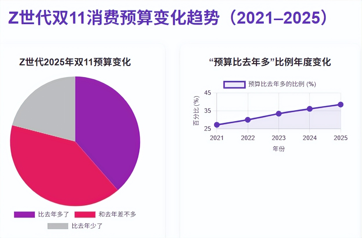 与整体理性消费趋势形成对比的是,Z世代的消费信心持续增强。数据显示,消费预算变化与去年相比,近四成被调查青年表示“比去年多了”(38.6%),北上广深青年这一趋势更显著、该比例达45.15%;四成选择“和去年差不多”(40.4%),增加预算与维持预算的群体合计占比近八成,表明大多数年轻人对“双11”消费持有较为积极的态度。“双11”预算消费金额的年度变化中,“比去年多了”的比例由2021年的27.3%上升至2025年的38.6%,反映出Z世代消费能力的稳步提升。