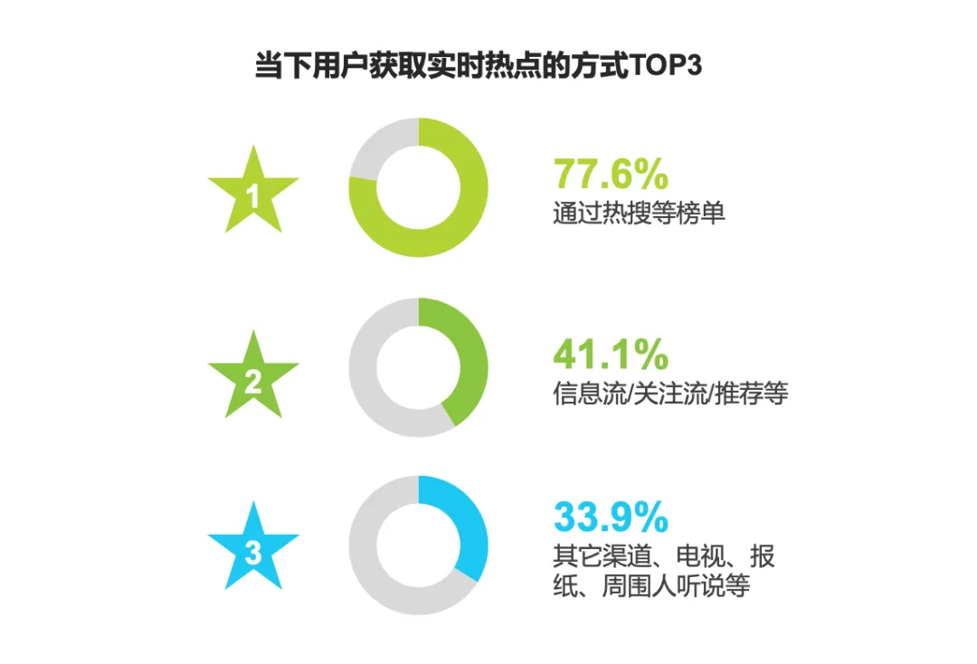唯有热搜是个例外。艾瑞咨询最近发布的《互联网平台热搜价值研究报告》显示,当下用户获取热点信息的第一大途径仍然是热搜榜单,77.6%的用户通过热搜获取实时热点,远超信息流及推荐的 41.1%。