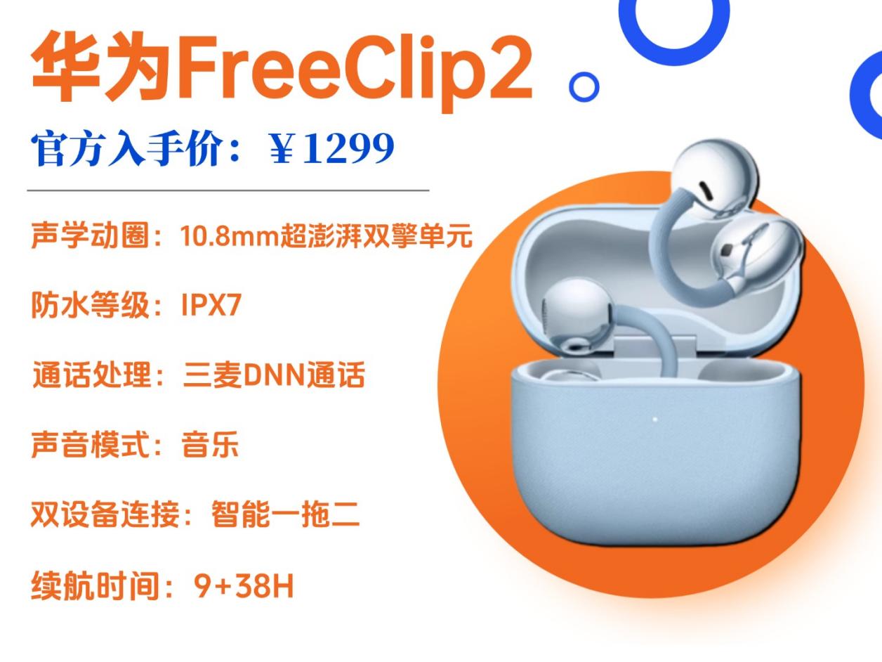 华为FreeClip2价格:1299 元推荐理由:旗舰级体验款,佩戴舒适度堪称天花板,鸿蒙生态用户使用体验更佳
