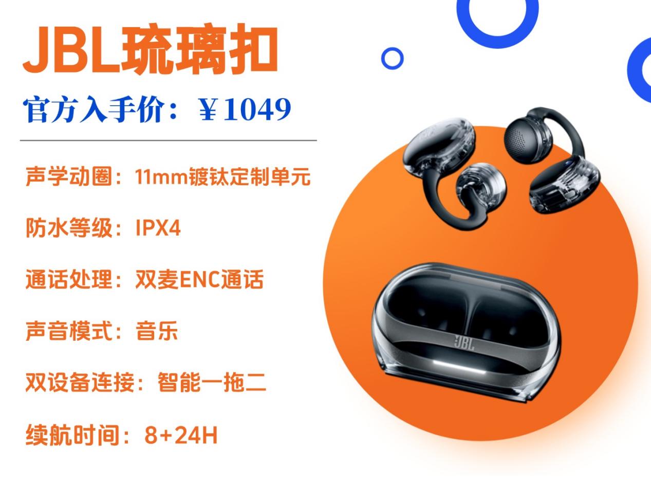 JBLClips琉璃扣售价:1049元推荐理由:旗舰级均衡款,听感均衡,支持自主调音,佩戴体验佳,操作灵活