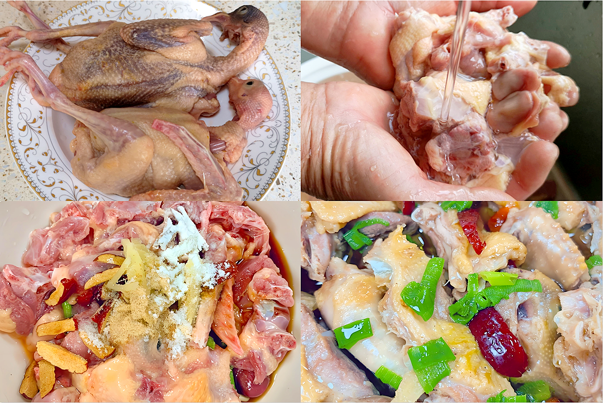 鸽子处理干净,剁成 4-6 块,放入清水中浸泡 10 分钟,去除血水,捞出沥干水分。