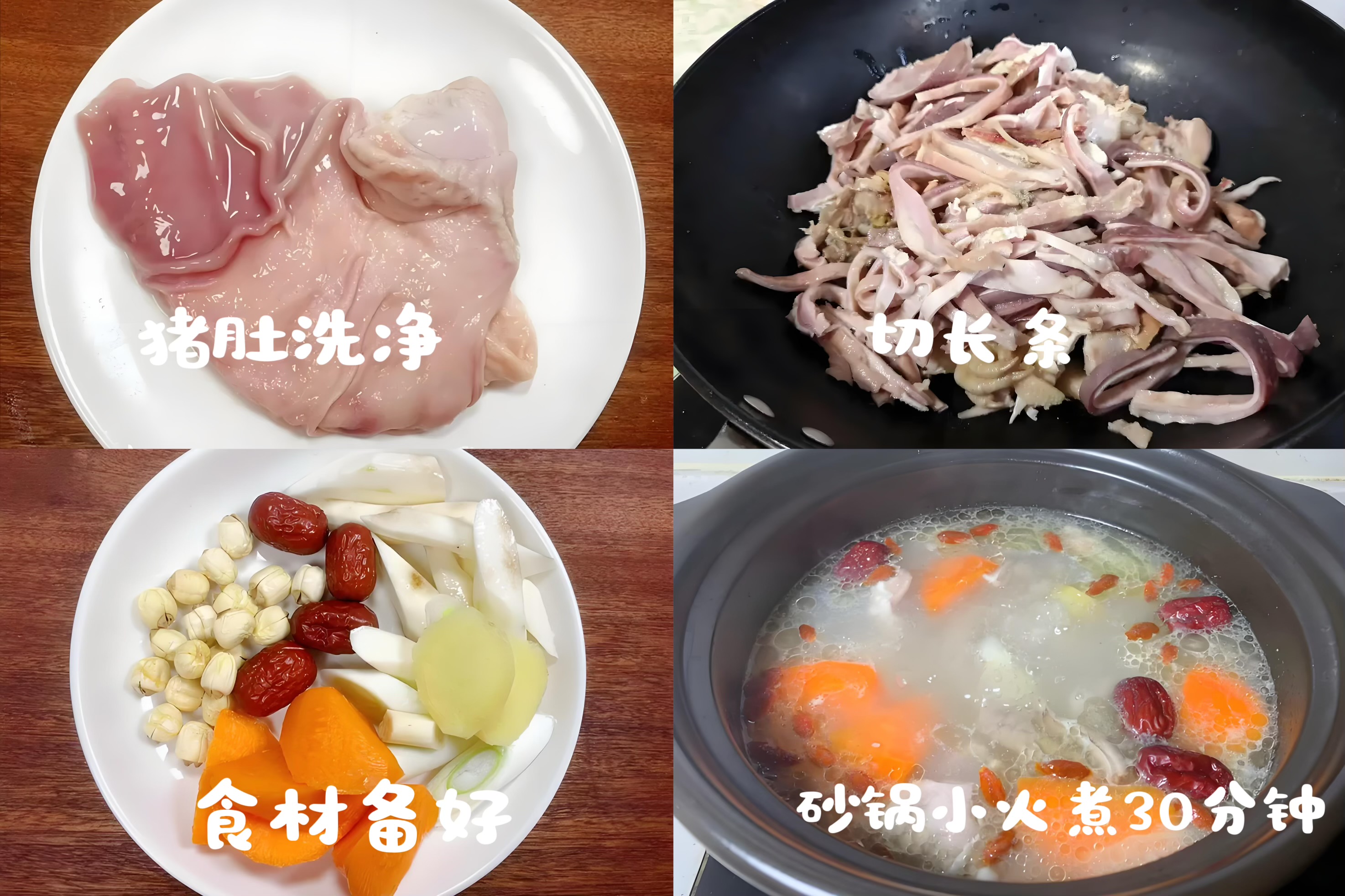 新鲜猪肚 1 个、山药 1 根、胡萝卜 1 根、干莲子 50 克、红枣 6 颗、姜片 4 片、料酒 2 勺、盐适量
