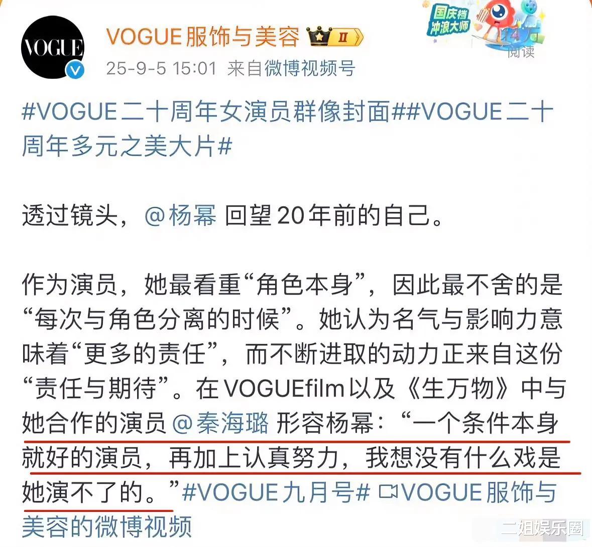 这还没完,一段VOGUE的采访中,秦海璐对杨幂的夸赞,也被顶了上来。