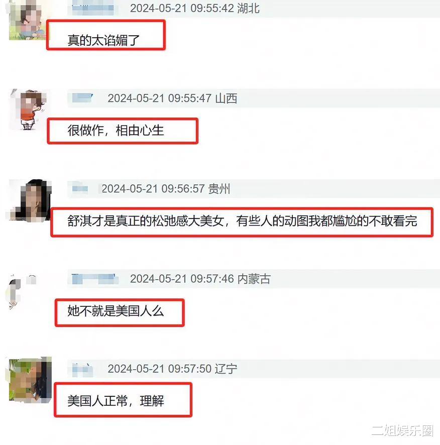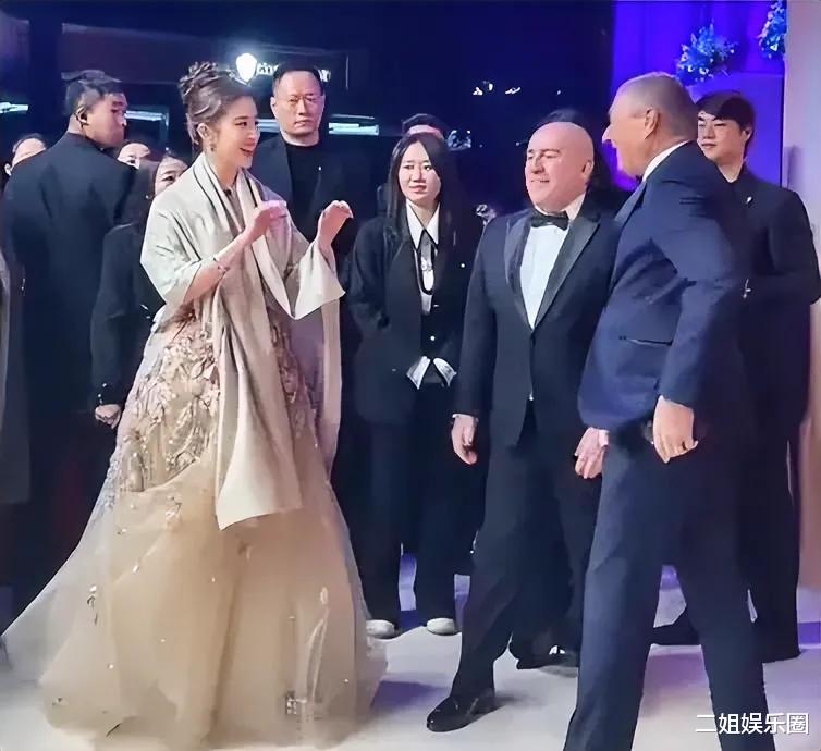 她和舒淇与国外女星一起合照,合影一结束后,突然大幅度地开始互动,捂嘴、蹲下、前倾后仰,表情、肢体动作都很是浮夸。