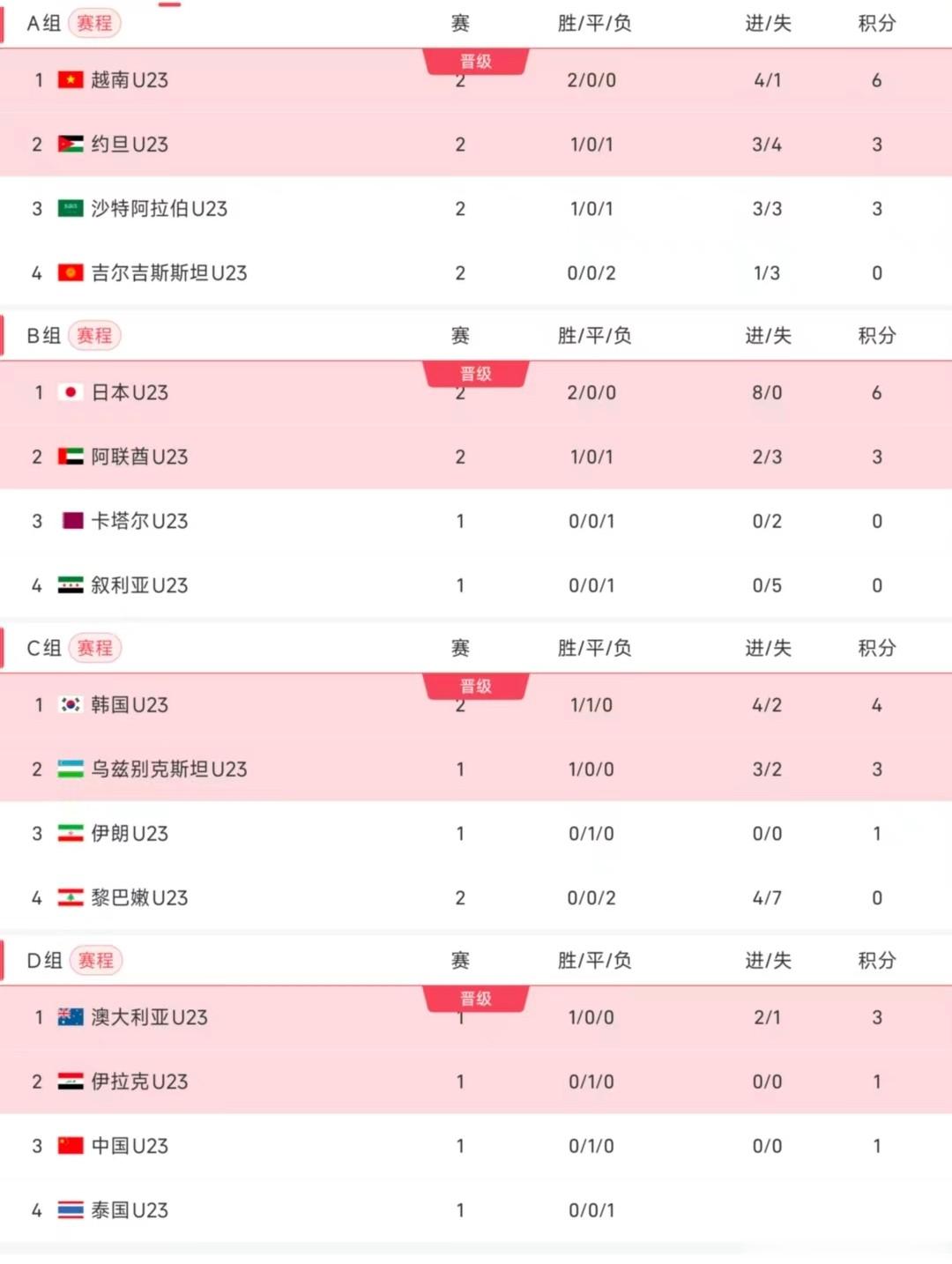 U23亚洲杯积分榜如下日本稳了,韩国队还不稳。