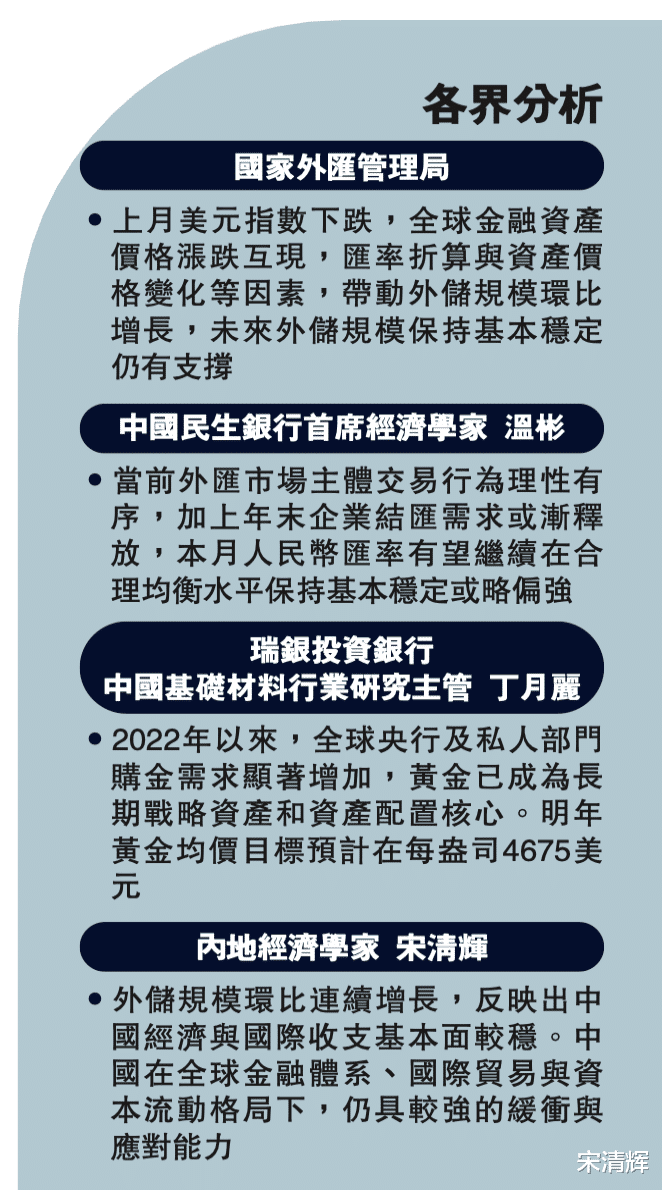 著名经济学家宋清辉指出,外储规模连续增长,表明中国在国际收支、跨境资本流动、汇率与资产价格变动等方面整体保持较稳健状态。从国家战略角度看,外储规模持续稳定在3.3万亿元或以上水平,可为中国应对外部冲击、维护国际支付能力、确保人民币汇率稳定,以及增加政策空间等提供“压舱石”。