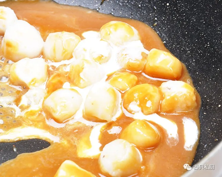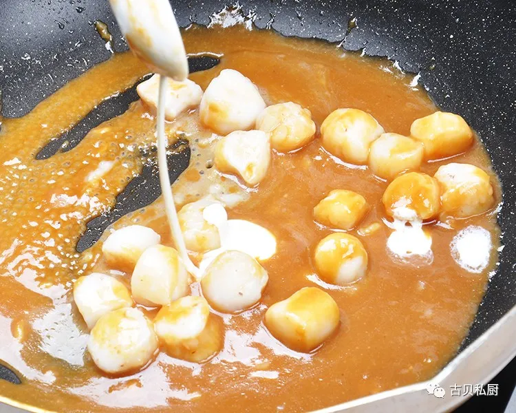 7、把扇贝肉盛出在锅内加入白葡萄酒、味噌味淋、生抽、细白砂糖和清水并搅拌均匀