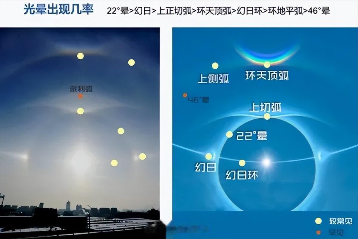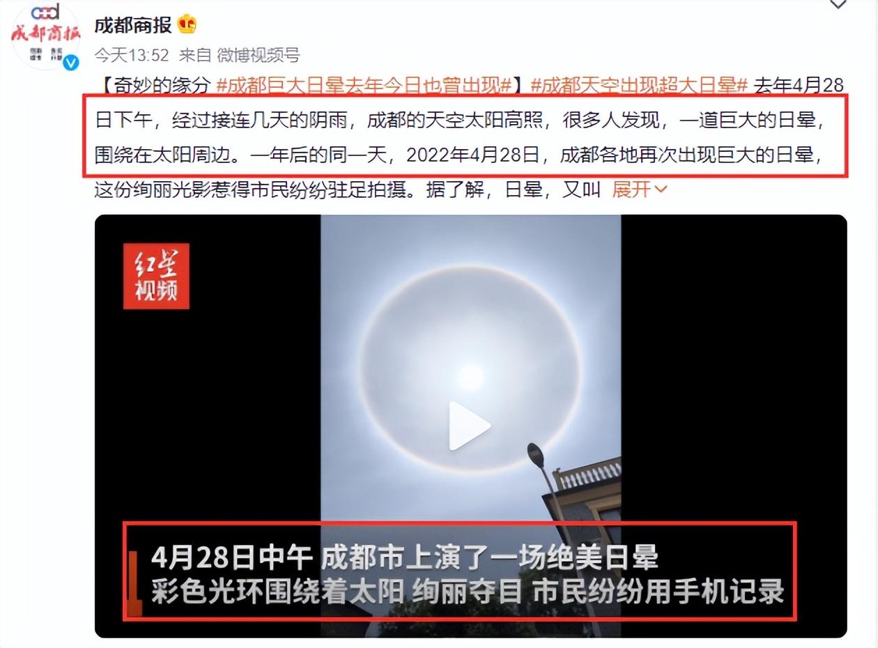 成都天空太阳“日晕”突然刷屏!两年同一天,究竟是好是坏? 在28日中午12点之后,因为罕见的太阳“美瞳”实在太美了,然后引发了一片热议!一来确实是因为它比较罕见,可不是每天能见到,况且是在这个单就出个太阳都能上热搜的程度上演。二来,更为巧合的是成都天空出现的日晕奇观在去年也曾发生过,而且还是同一天。 关于日晕民间有很多说法,从古人的角度更是以“阴阳视角”出发,被认为是不祥之兆。而日晕也被称为地震前兆,能预测反常现象即将发生。但是事实真的如此吗?魔方看来,显然这些都是没有科学依据的。 首先就成因来说,日晕其实就是一种自然景大气光学现象,它也被称为圆虹,其形成只和高云密切相关!当天空有云卷层云的时候,空气中会漂浮着无数的冰晶,而在太阳周围且和太阳处在同一圈的冰晶则能够将同一种颜色的光折射到人的眼睛里,从而形成从内到外红色到紫色的彩虹光环。因为冰晶量的多少以及太阳照射情况不一其形成的日晕画面也会有所区分。 其次,就日晕的“家族”成员来说,还包含了“多个太阳”的幻日、“白虹贯日”的幻日光环、“天空的微笑”的环天顶弧以及“燃烧的云彩”的环地平弧。他们都是自然的光学现象,并不存在别的什么不祥之兆的意思。包括日晕的科学原理,它们都是早已被专家们验证了的。 日晕有9、18、20、22、23、24、35、46度晕的区分,但通常情况下最常看到的就是像此次成都这样的22°日晕。它从本质上是由六角柱状冰晶条构成,而比如像9°的“晕”则是当卷云呈现六角锥状或钻石状构成时候出现。 值得一提的是,专家也曾多次提醒,因为雨后的日晕及其“家族兄弟姐妹”出现会伴随有刺眼强光,因为冰晶的折射面多对光线折射更强,而人眼是有一定的承受耐力的,所以还是要谨慎。奇观虽美,可千万不要拿眼睛开玩笑哦~