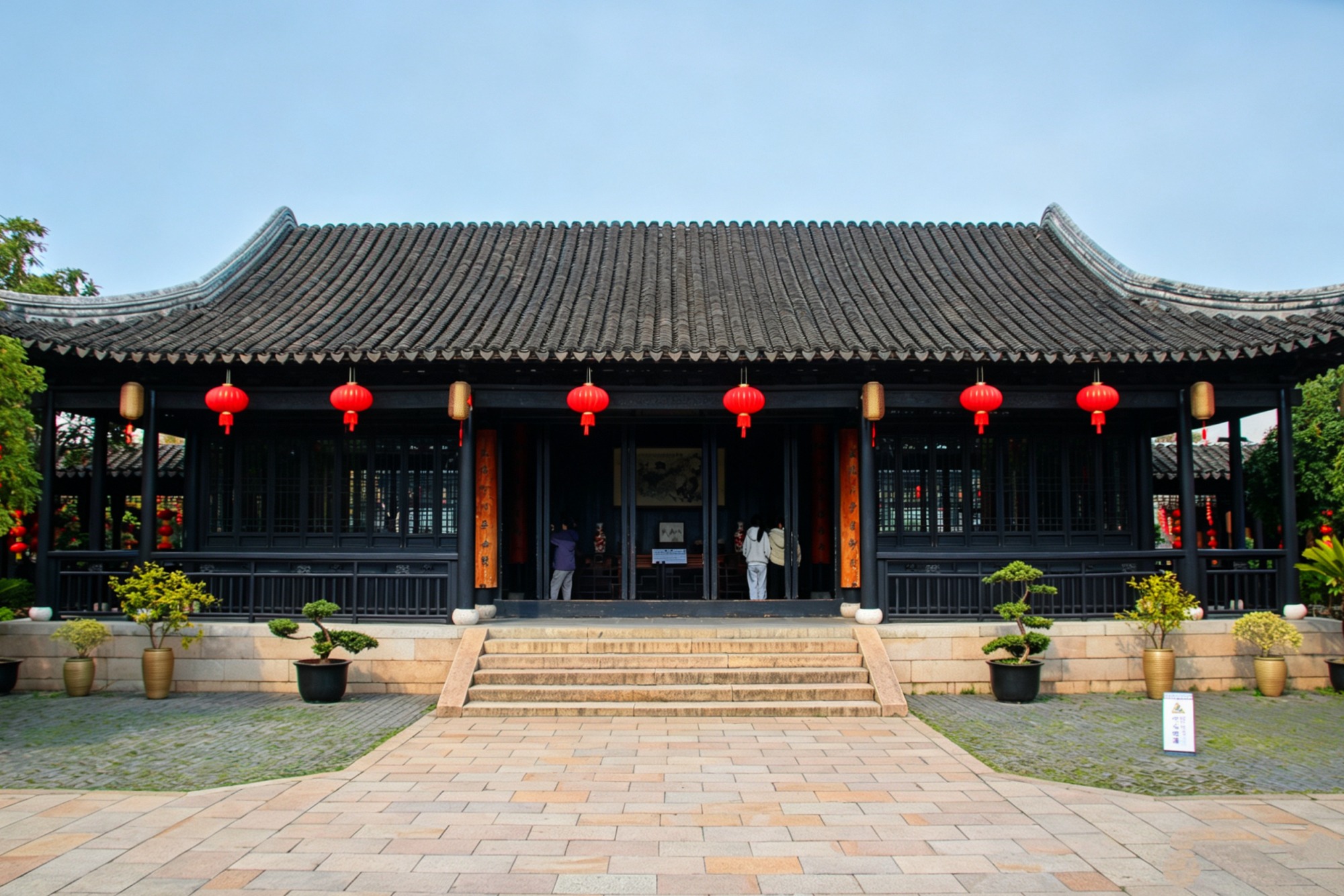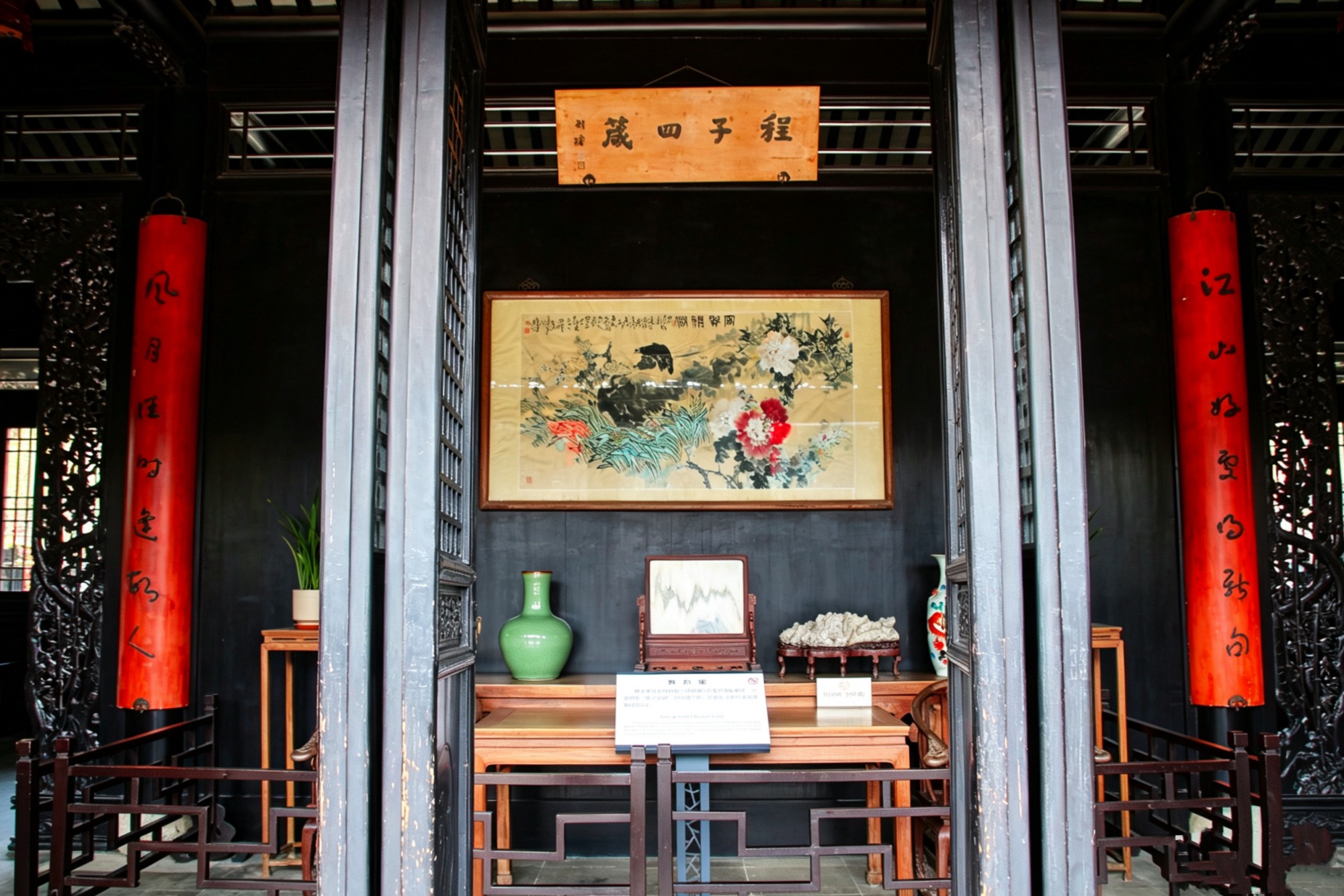 “程子四箴”厅黑瓦木构,檐下挂着大红灯笼,远远看去气势恢宏,既有江南建筑的雅致,又不失皇家行宫的气派。厅堂内陈设着苏式家具、书画瓷器,清时士大夫的读书生活跃然眼前。
