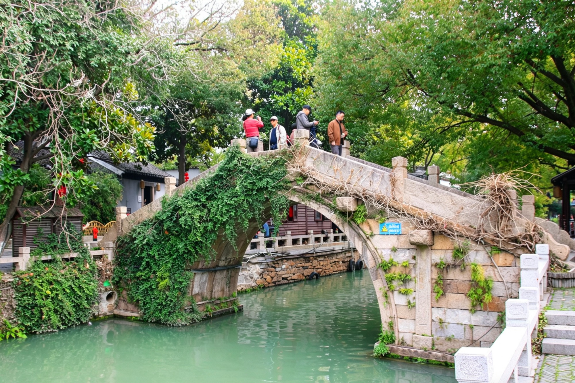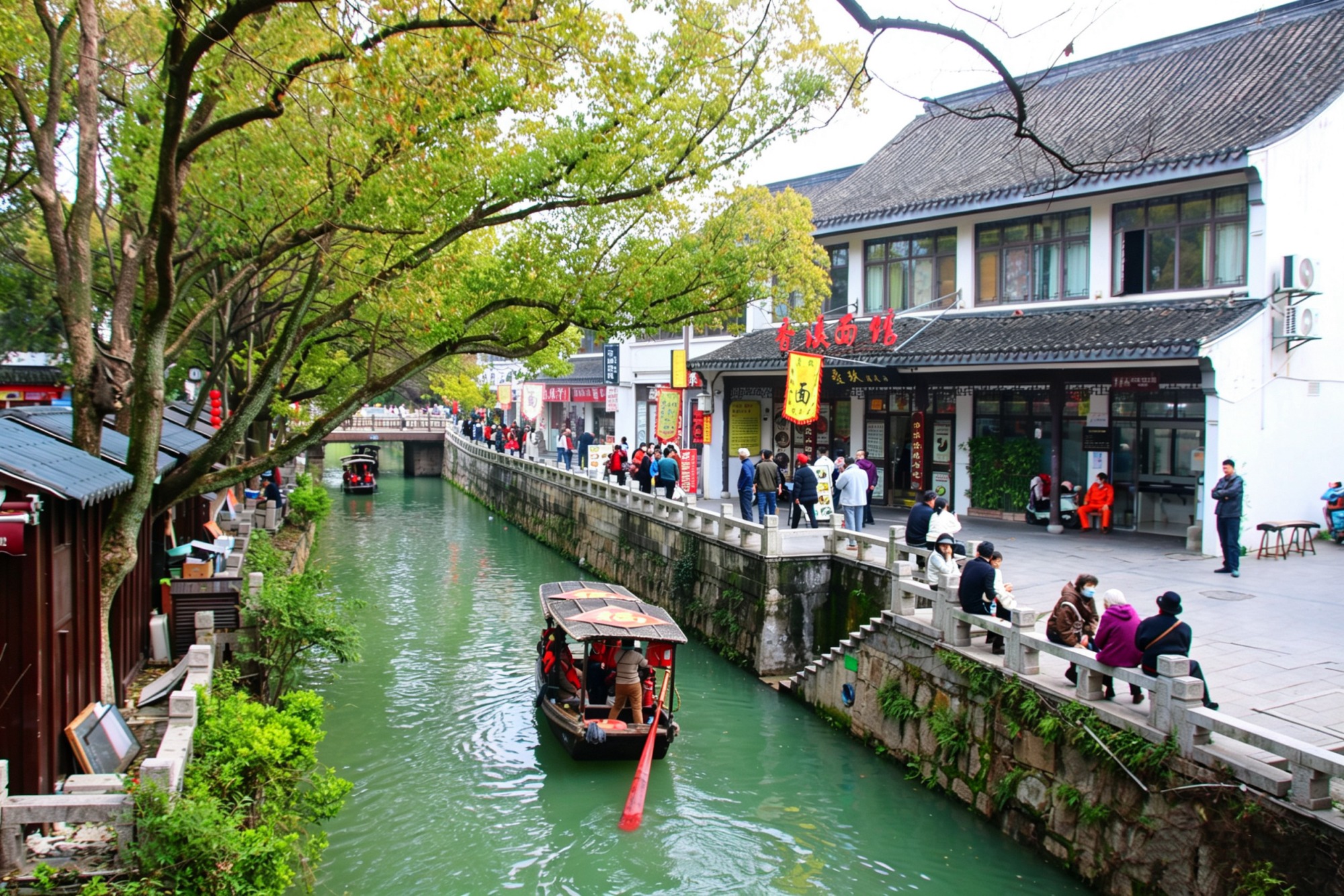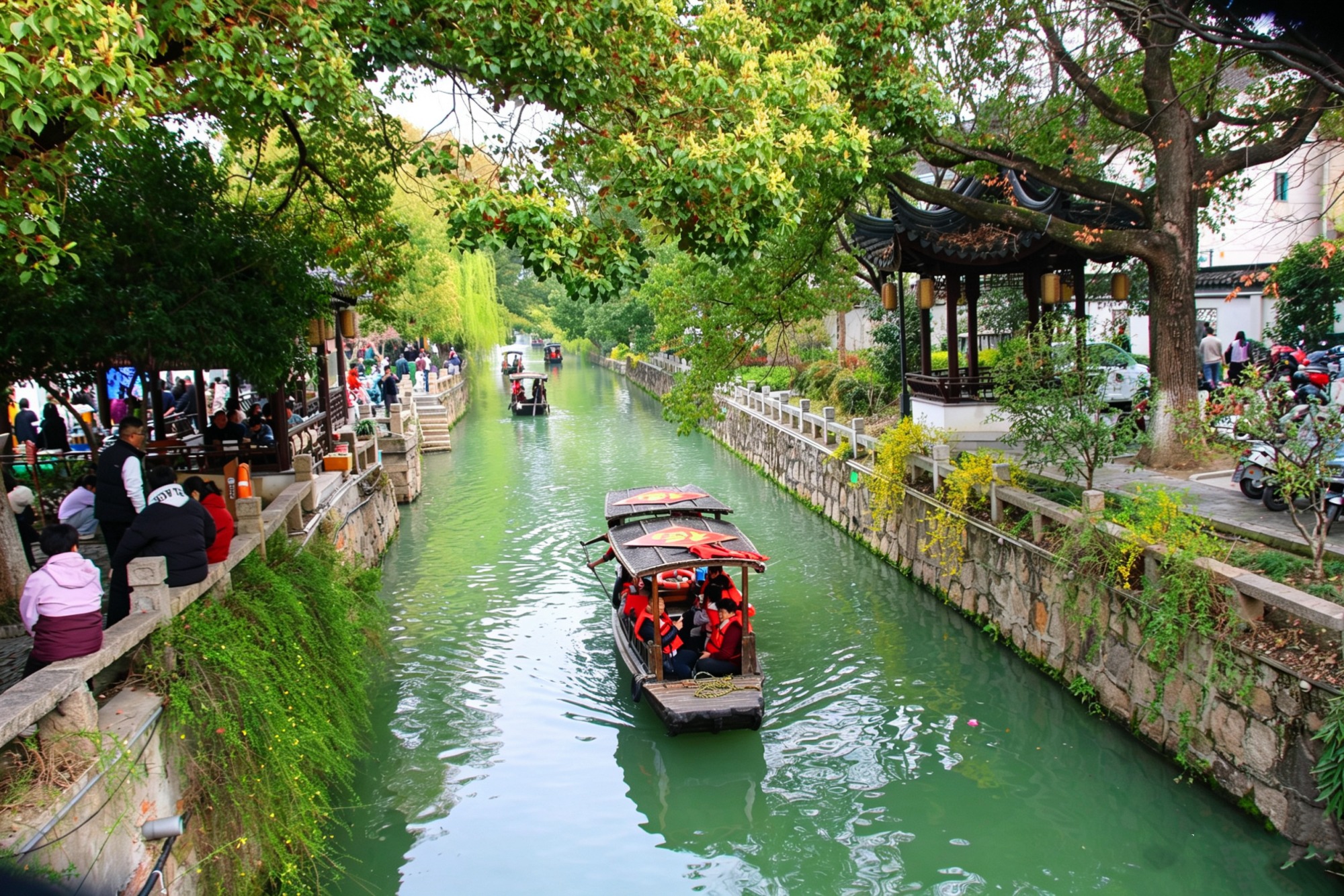 古镇内河道纵横,摇橹船沿河而下,从船上看岸边,白墙黛瓦的商铺、民居错落有致,翠绿的枝叶伸进河道,一路穿桥过巷,沉浸式感受“君到姑苏见,人家尽枕河”的江南风情。