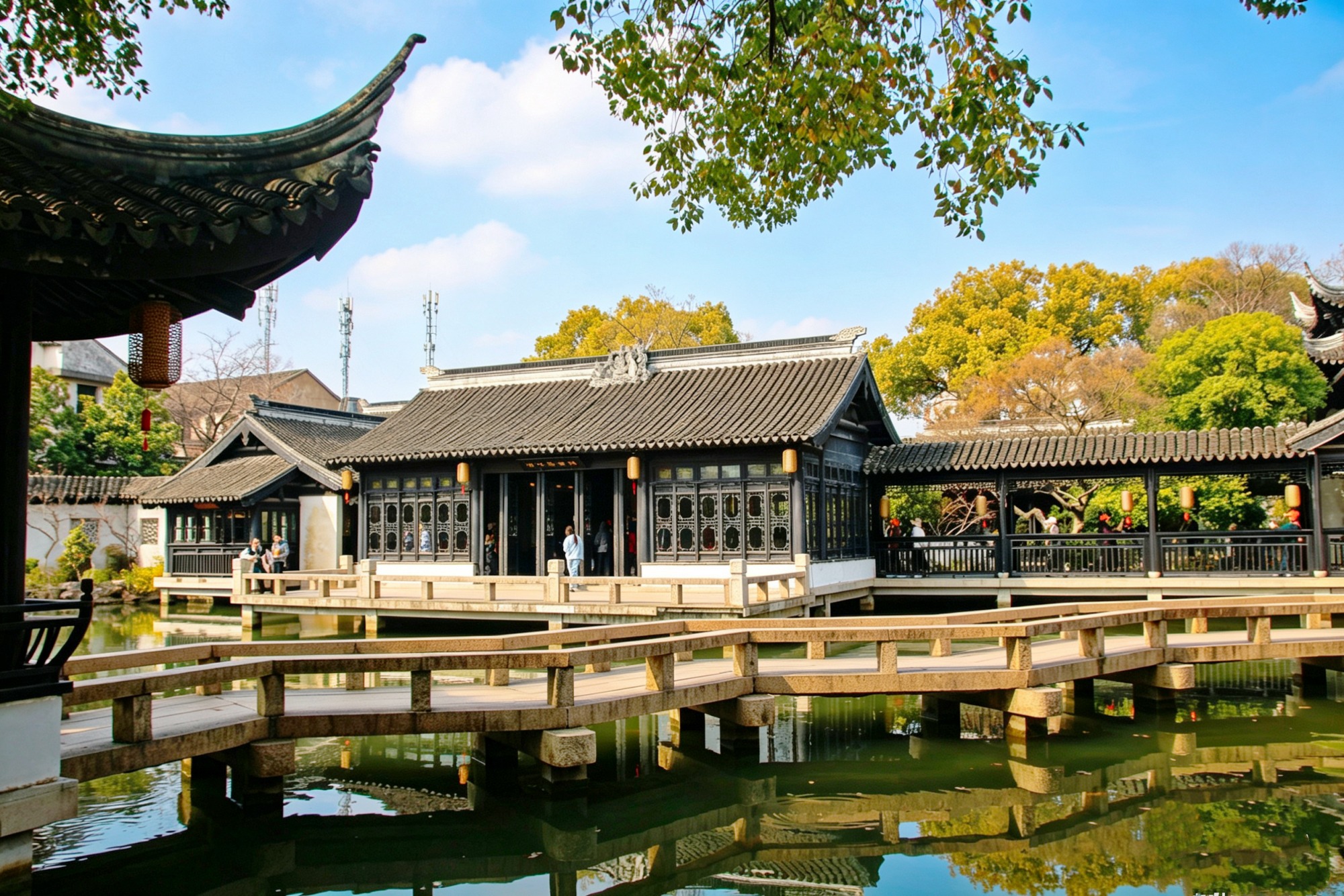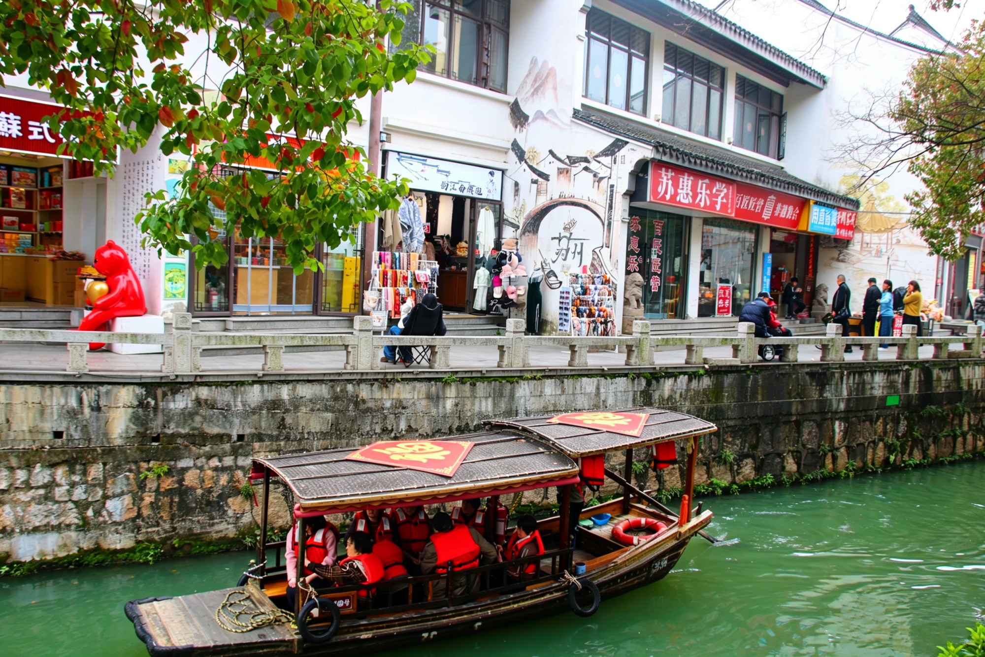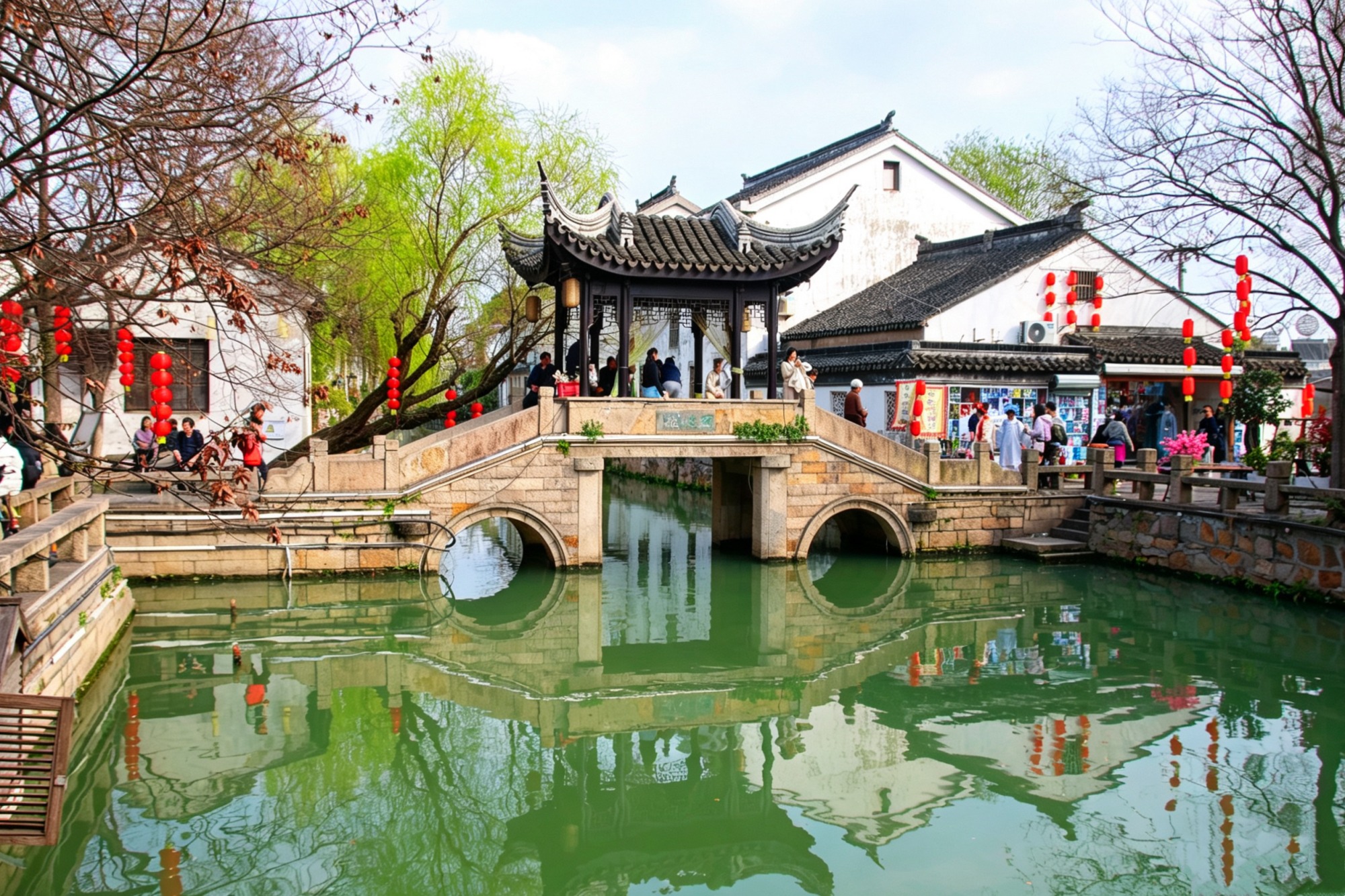 古镇内河道纵横,摇橹船沿河而下,从船上看岸边,白墙黛瓦的商铺、民居错落有致,翠绿的枝叶伸进河道,一路穿桥过巷,沉浸式感受“君到姑苏见,人家尽枕河”的江南风情。