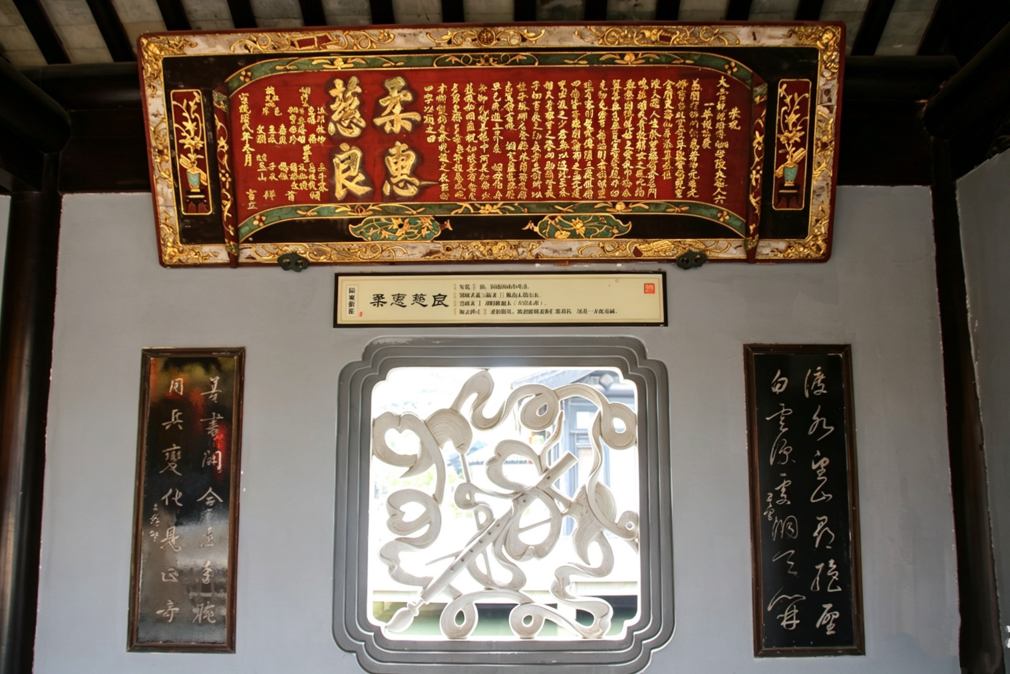 古镇老宅的雅致和韵味藏在大大小小的细节处,清代“柔惠慈良”匾额通体鎏金,工艺精湛,是古代对女性品德的赞誉;镂空花窗雕刻着如意、书卷等吉祥纹样,是苏式木雕的精品。