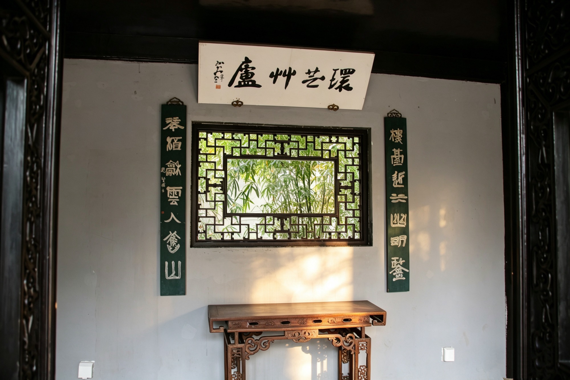 镂空花窗将翠竹框成一幅天然水墨画,搭配墙上的书法匾额与楹联,每一处细节都透着江南士大夫的生活情趣。
