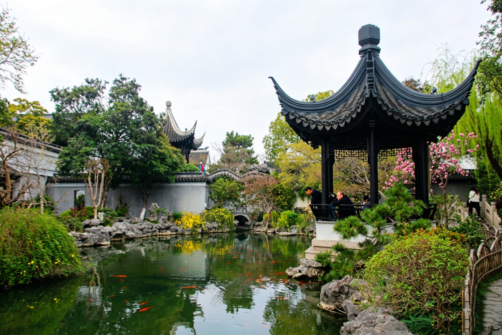 清澈的池水倒映着亭台楼阁,锦鲤游弋其中,仿佛红宝石闪在水中。岸边叠石堆山、花木葱茏,黑瓦飞檐的凉亭临水而建,隐隐有花香传来,沉静的氛围让人不想挪动脚步,只想坐在水畔盯着一池碧水发呆。