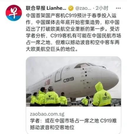 联合早报27日报道称, 中国首架国产客机C919预计于春季投入运作,中国媒体去年底开始密集造势,称中国迈出了打破欧美航空业垄断的第一步。受访学者分析,C919客机有可能在中国民航市场占一席之地,但难以撼动波音和空中客车两大欧美航空巨头的地位。 其实中国发展国产大飞机,并不是要与美国波音和欧洲空客进行竞争,而是要立足于国内市场,服务于中国人民。因为中国的民用市场足够之大,中国大量购买的波音和空客客机已经到了需要更换的周期,中国国产客机C919恰逢其时。 目前中国,C919客机订单已经超过1000架,这也足够,中国商飞最近几年的生产需求。按照中国有关专家对外的分析,中国商飞只要能够对外销售500架左右的C919客机就可以收回研制成本,这就意味着中国C919客机已经拥有1000架的订单,已经意味着实现了盈利。 既然中国商飞已经实现盈利,那么中国未来立足于国内市场就没什么问题。一句话,只要中国双飞能够生存下来,这就是中国大飞机事业发展的良好开端。如今看来这一目标已经基本可以实现,并且随着国产化步伐的进一步推进, C919客机将会开启中国大飞机的真正腾飞之路。 至于是否能够竞争过美国波音和空客,我们暂时没有这样的打算。但是只要C919能够满足国内市场,中国市场足够强大,足够让中国商飞能够实现腾飞。当中国技术成熟度越来越高之后,相信中国大飞机在国际市场上必然会拥有更庞大的竞争力。届时超越美国波音和欧洲空客恐怕也不是什么难题。