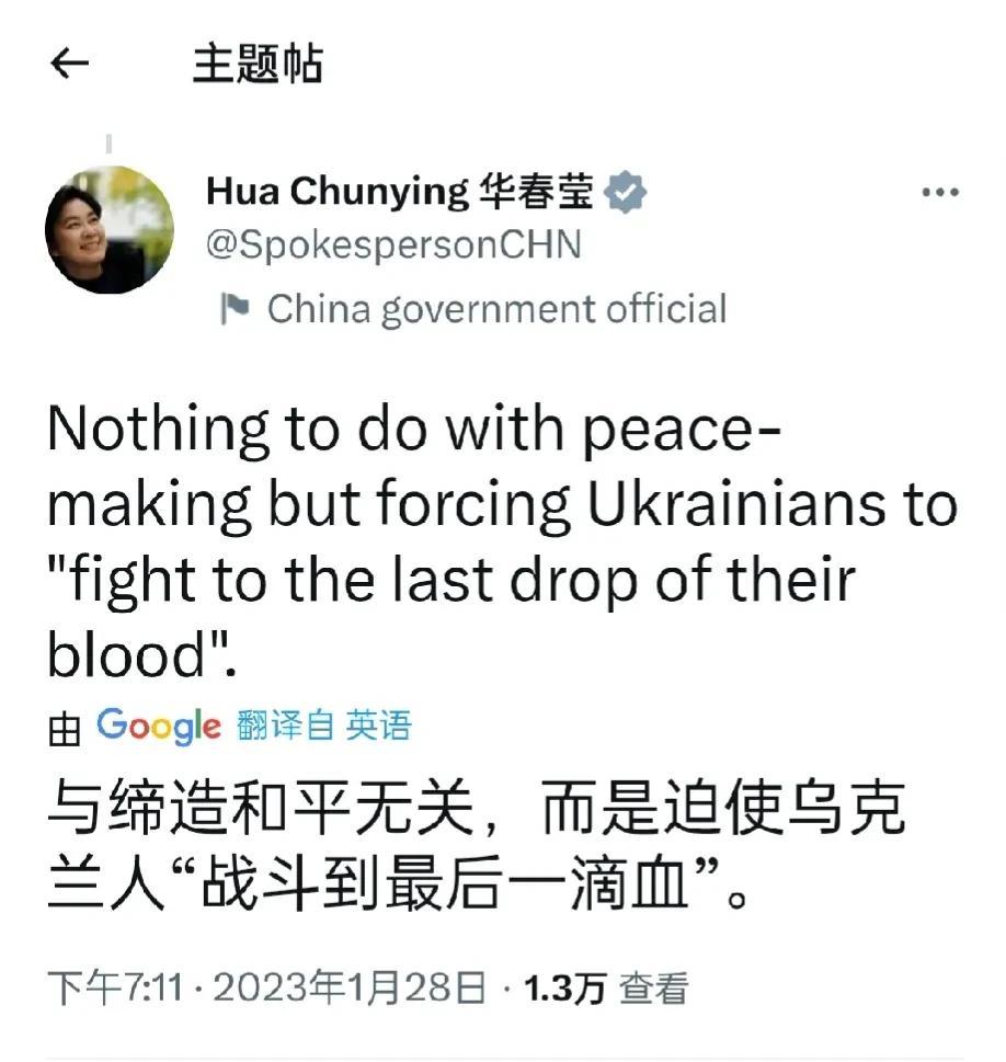 我们的美女外交发言人华春莹今晚(28日)发挥抨击美西方向乌克兰提供坦克。华春莹称:坦克能给乌克兰带来和平吗?向乌克兰派遣包括坦克在内的致命武器(并敦促其盟友这样做),同时在没有证据的情况下制裁据称“可能提供援助”的外国公司,这无异于勒索和欺凌。与缔造和平无关,而是迫使乌克兰人“战斗到最后一滴血”。 美国从来就没想给乌克兰人民任何何平,美国就是在利用乌克兰人民来消耗俄罗斯的国力。如果美国真的想要为乌克兰人民的和平,就不会被乌克兰当局提供坦克,而是促进乌克兰当局与俄罗斯方面选择和谈,尤其是俄罗斯方面已经发出和谈信号,可是美国却指使泽连斯基政府不允许和谈。美国坦克进入阿富汗和伊拉克,哪一个是为了何谈而来,不都是要将战争进行下去吗? 美国才是这场俄乌冲突的背后黑手,为了赚取更多的利益美国一定要让这场俄乌冲突继续打下去。显然在当下俄罗斯已经扭转乌克兰的整体局势,这让美国看到了,乌克兰局面即将面临失败,就要为乌克兰提供主战坦克来试图扭转战局。这哪里是为了乌克兰的和平,这分明就是要耗光最后一个乌克兰士兵。 就像我们的美女发言人华春莹所指出的一样,美国其实就是在拿乌克兰人当棋子,让乌克兰人成为拖垮俄罗斯的战争泥潭。然而现实的状况是,巴赫穆特战役已经成为乌克兰人的绞肉机,大量的乌克兰士兵就泯灭在这里。而美国却还不想面临失败,那就只能加大对乌克兰的投入力度,让乌克兰人为美国利益而献出生命!