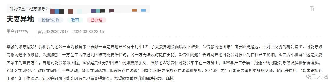 这是一位在人民网上留言的异地教师,因与丈夫长期异地,时间长达12年,并列举9条生活和情感上的困难,最后希望得到领导的帮助。