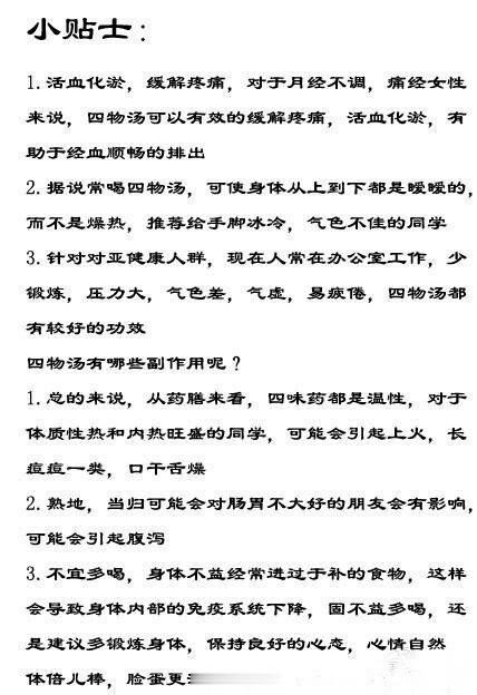 【女性调理必备——四物汤】有的姑娘体质较差,常有手脚冰冷或者易气虚潮热的症状,稍一运动就易出虚汗。分享下面这个简单的方子,对夏天怕热冬天怕冷的问题很有效!可有助于气血通顺、 并使脸色红润,材料易得,制作简单,试试吧~