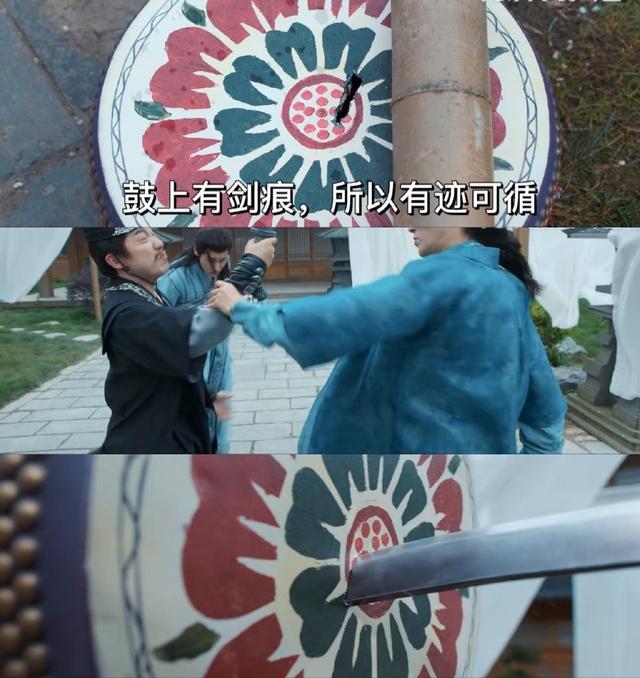 1.起冲突时,寒狰并不打算真的和老胡动手,所以只是把老胡推开,刀插进鼓皮,所以有在现场留下痕迹的镜头;