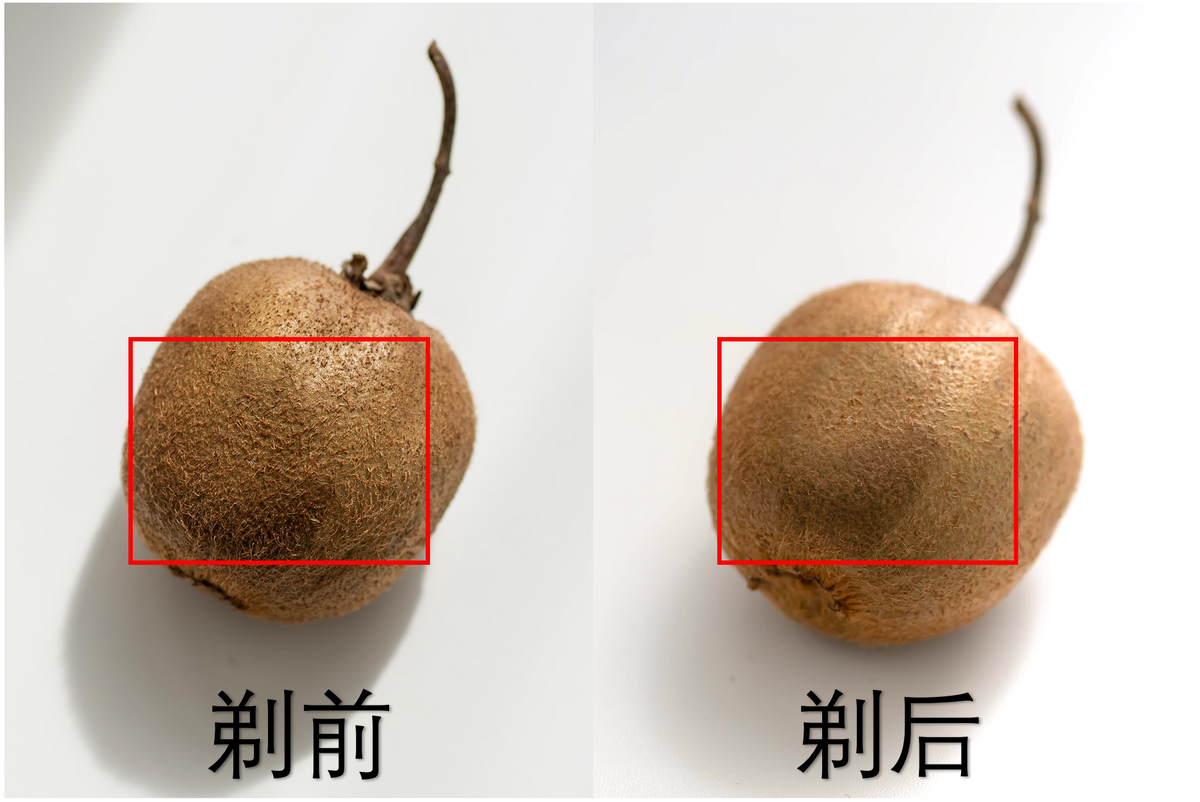 首先,我们用少量水打湿的猕猴桃来模拟胡须及皮肤油脂,之后用剃须刀以恒定速度和压力反复剃须3分钟,观察绒毛残留。实测过程:猕猴桃表面的绒毛又细又密,很像细软胡须。未野剃须刀一贴上去,就能听到清脆的“切割声”,3分钟后翻过来一看,接触过的区域绒毛几乎被剃光,只剩零星几根特别短的,用手摸上去没有扎手的“ stubble 感”。
