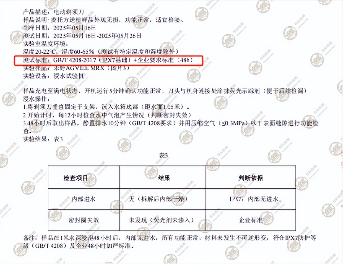 专业机构检测发现未野剃须刀48小时全机身浸泡无进水。
