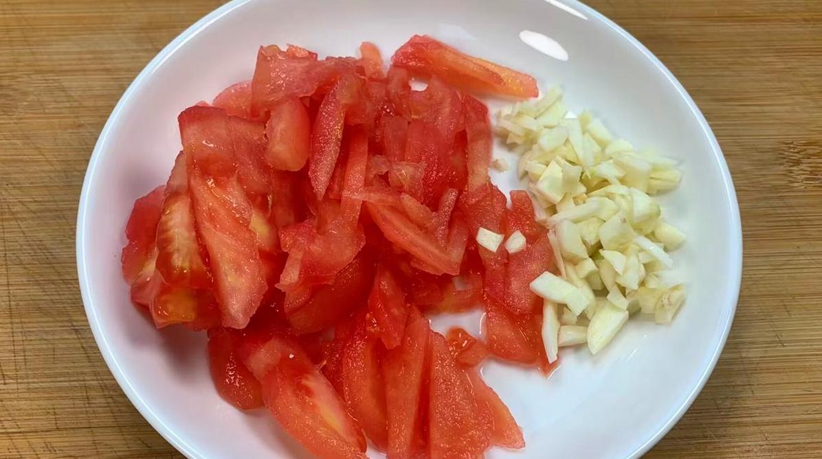 丝瓜去皮切段,西红柿剥皮切块,大蒜切末。