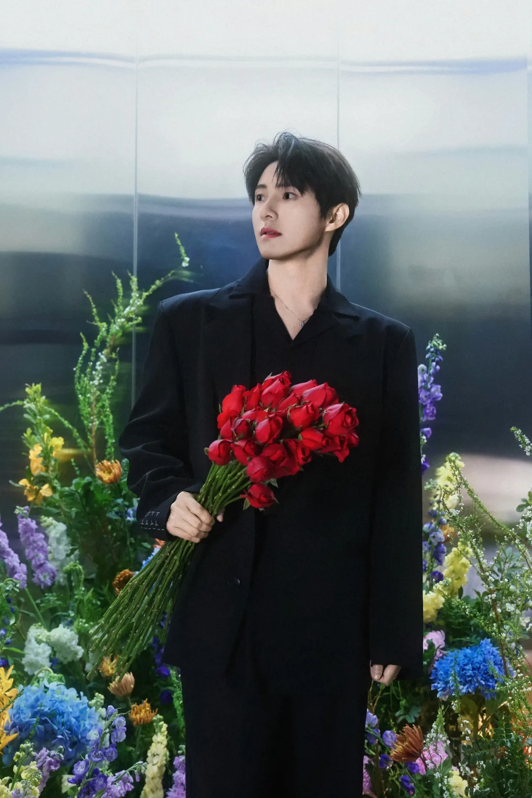 鲜花主题写真当中,黄圣池身着全黑西装,利落剪裁勾勒挺拔身形,背景中五彩斑斓的花海充满早春旺盛的生命力,海蓝绣球、紫罗兰、浅粉牡丹菊、橙色千代兰、火红玫瑰等鲜花环绕。花丛中,黄圣池手持红色玫瑰,眼神清澈,指间蝴蝶轻舞,柔美的花丛更强化了黄圣池的轻熟硬朗与灵动的少年感。
