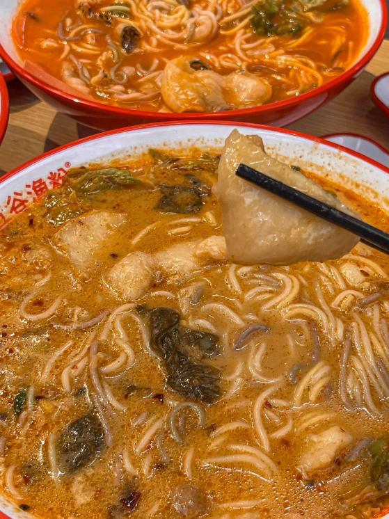 渔粉真的超出预期!选的灵魂酸辣味太对味,汤底浓郁够劲,酸辣口感超解馋~ 五谷渔粉藏着五种不同食材的面条,还配了豆腐、酸菜等配菜,一口下去口感超丰富!