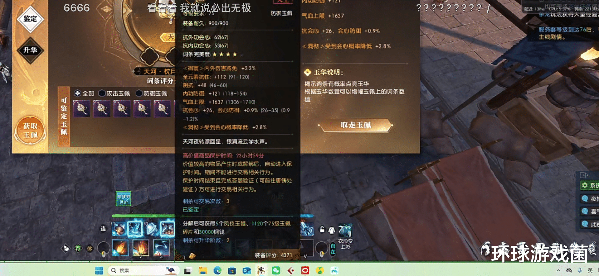 浮夸也不例外迅速开始砸钱,直接全游戏收购极品玉佩胚子,并开始沉迷直播切玉佩,经常一切就是几十上百万的投入,国庆8天至少砸进去了百万人民币,不过功夫不负有心人,浮夸也是终于切出了整个黄金服最强的极品玉佩,直接把他的装备总评干到了全服第一!