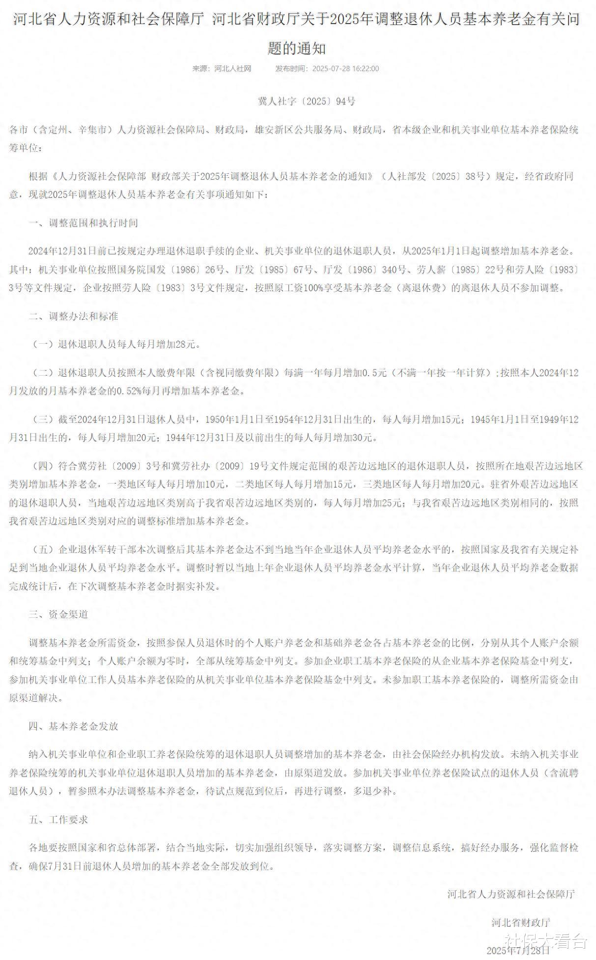 7月28日,从河北人社传来了好消息,河北2025年养老金调整方案官宣落地,有图有真相。