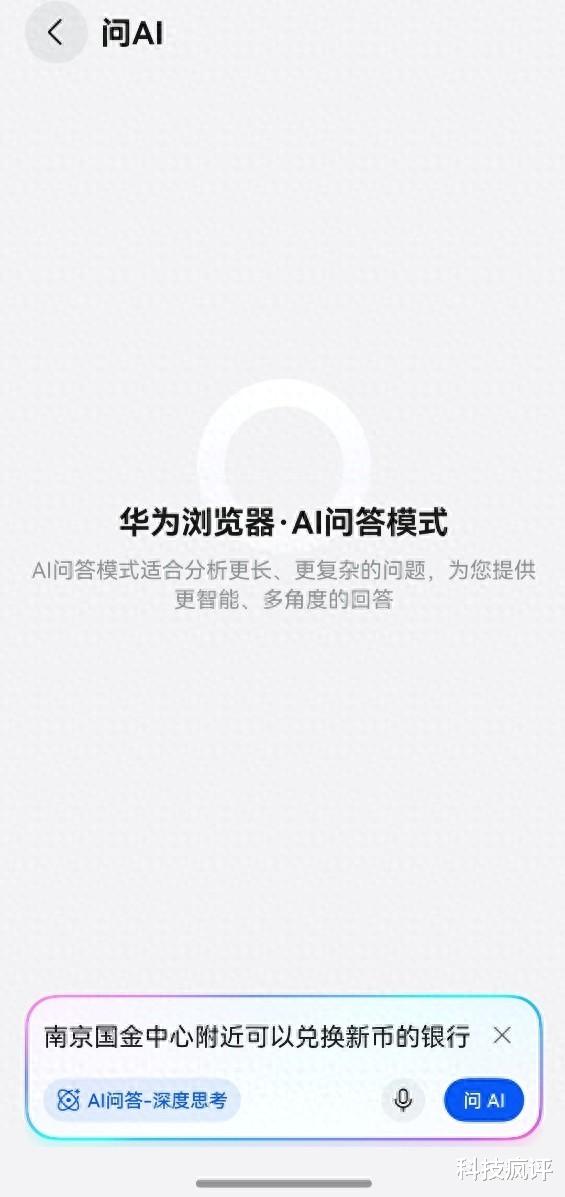 比如这次,我直接打开华为浏览器搜索框,勾选“AI问答-深度思考”,发送我的需求:“南京国金中心附近可以兑换新币的银行”。