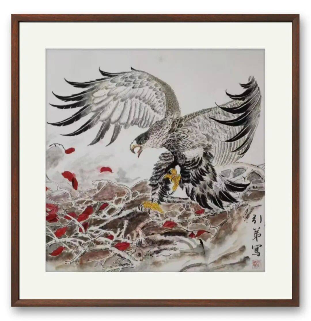 除牡丹之外,其花鸟创作亦独具匠心、个性鲜明。石榴颗粒饱满、晶莹欲滴,藏着丰收的喜悦与生活的热忱;葡萄如珠如玉、晶莹剔透,浓淡虚实间尽显节奏感与生命力;丹顶鹤仙风道骨、姿态清雅,承载着古人对高尚品德的期许,更寄托着她对高洁心性的坚守;而笔下之鹰,摒弃了常见的威猛霸气,独绘其孤傲坚守、坚韧抗争之态,与松石相融,如雕塑般挺拔,暗合“高处不胜寒”的人生哲思,赋予作品超越物象本身的深层内涵,于细微处见深意,于寻常中显格局。
