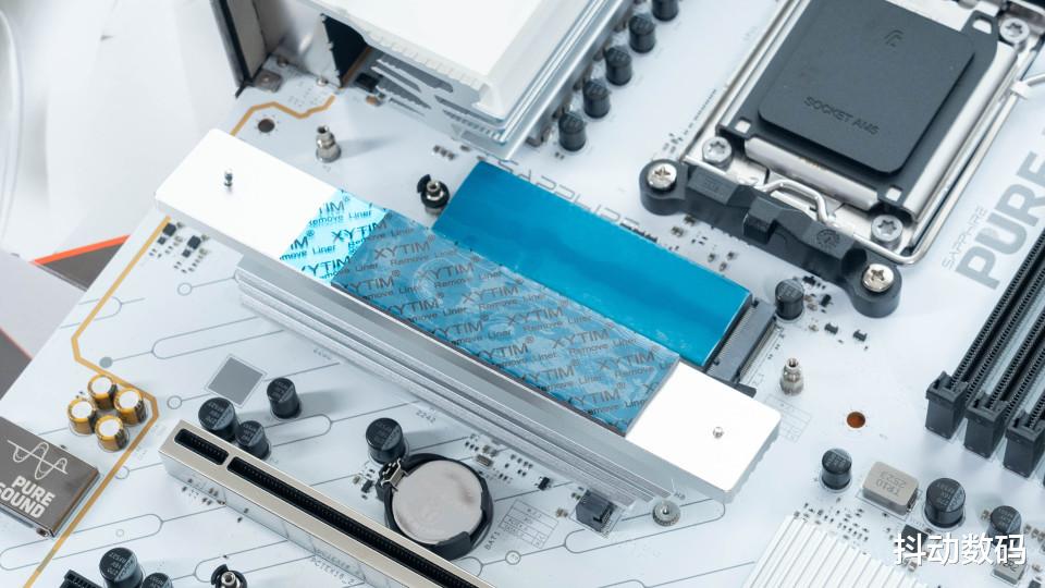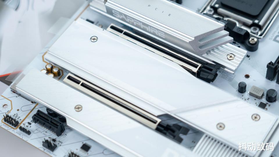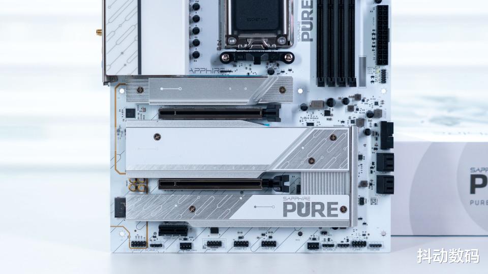 蓝宝石 PURE 极地 X870A WIFI7主板上设计了三个 M.2 SSD硬盘位,其中最靠近处理器的阶梯式堆叠设计,可以充分保证PCIe 5.0协议的M.2 SSD的稳定读写。